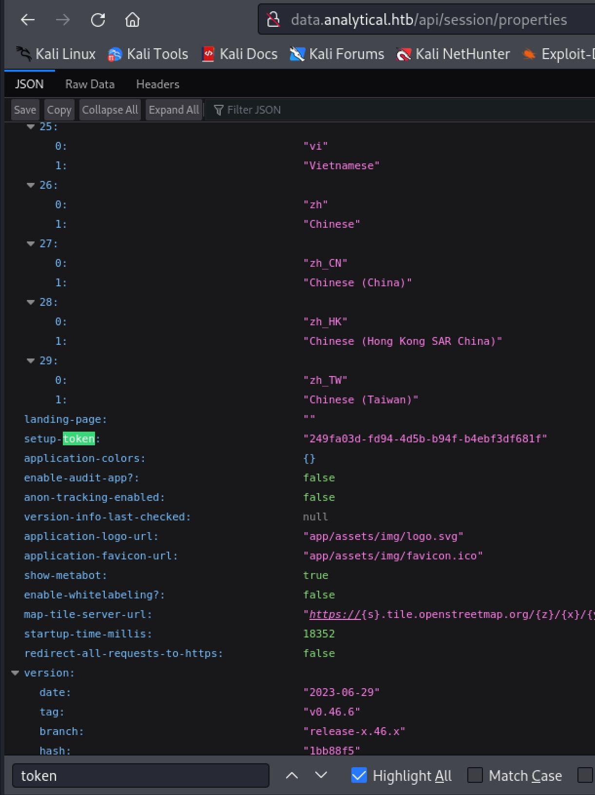 We will need to change the Host field to data.analytical.htb. Secondly we will need to find the token for our instance of the web application and replace that. We can do this by browsing to /api/session/properties as outlined in the blog post.