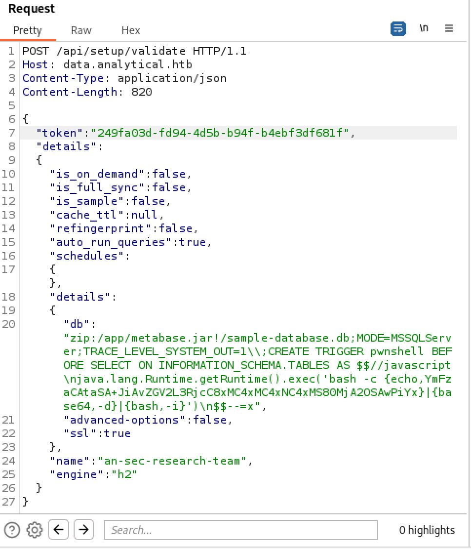 using the search terms "Metabase exploit" returns results for a pre-auth Remote Code Execution (RCE) vulnerability, CVE-2023-38646. "The root cause of this vulnerability is that the setup token is not cleared after the setup is completed. This allows an unauthenticated attacker to get the setup token and use it to execute commands on the target remotely." From here I pivoted to searching for a Proof Of Concept (POC) for the exploit. In doing so I came across an excellent blog post that outlines the process of the attack. The blog provides us with a POC web request payload.