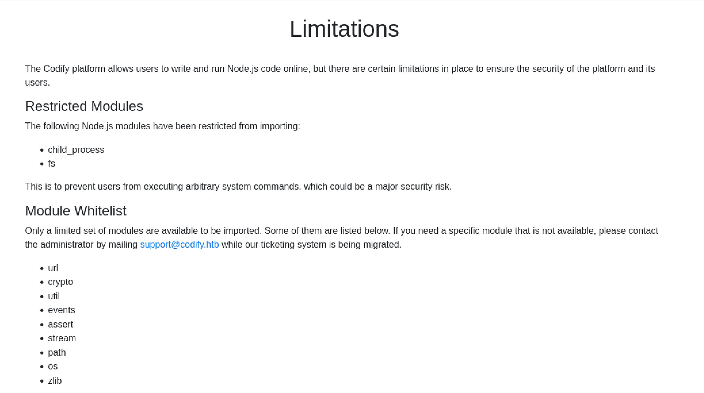 /limitations is a page that displays what appears to be whitelist and blacklist information for the provided web application. This will be useful to have as a reference later.