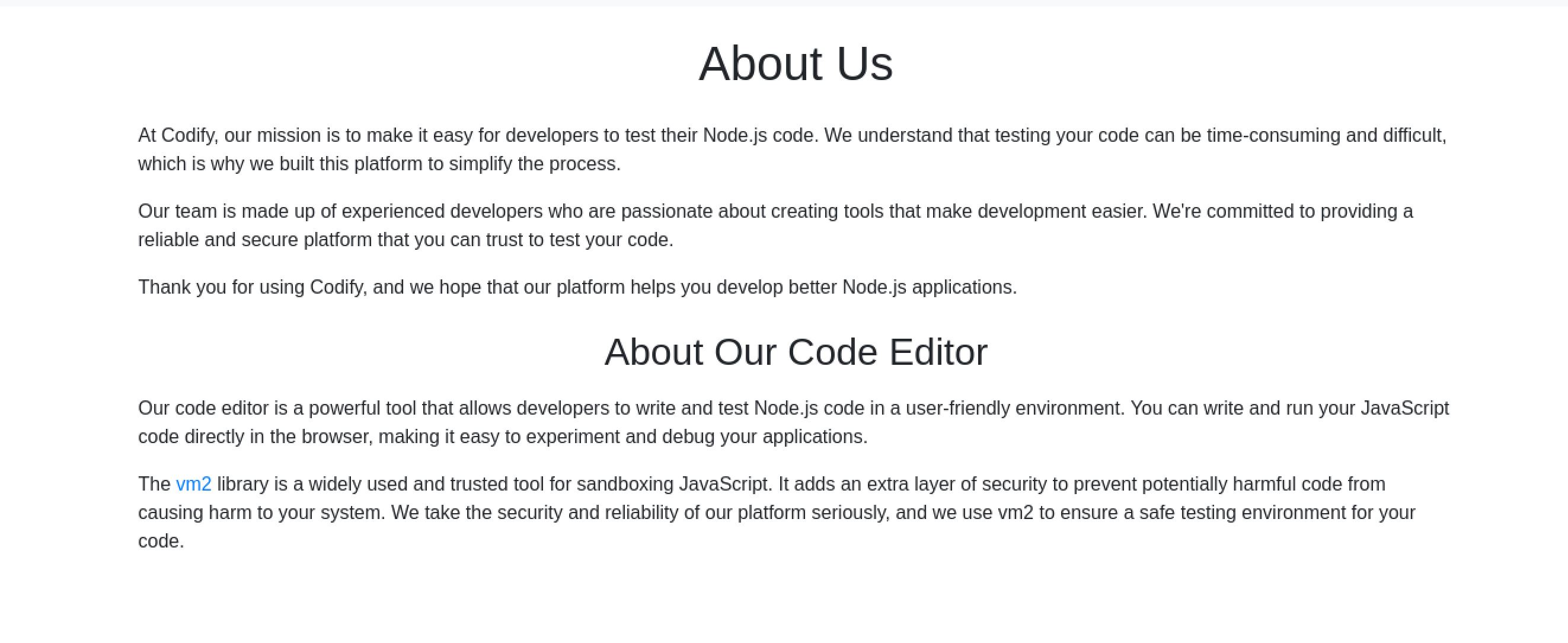 The about us tab links to /about which displays some generic information about the application developers. Interestingly there is also a mention of the Vm2 library being used for sandboxing the java script. This will be very useful information for later and is our route to exploiting the machine. It is always good to fully enumerate before attacking though so we will continue.