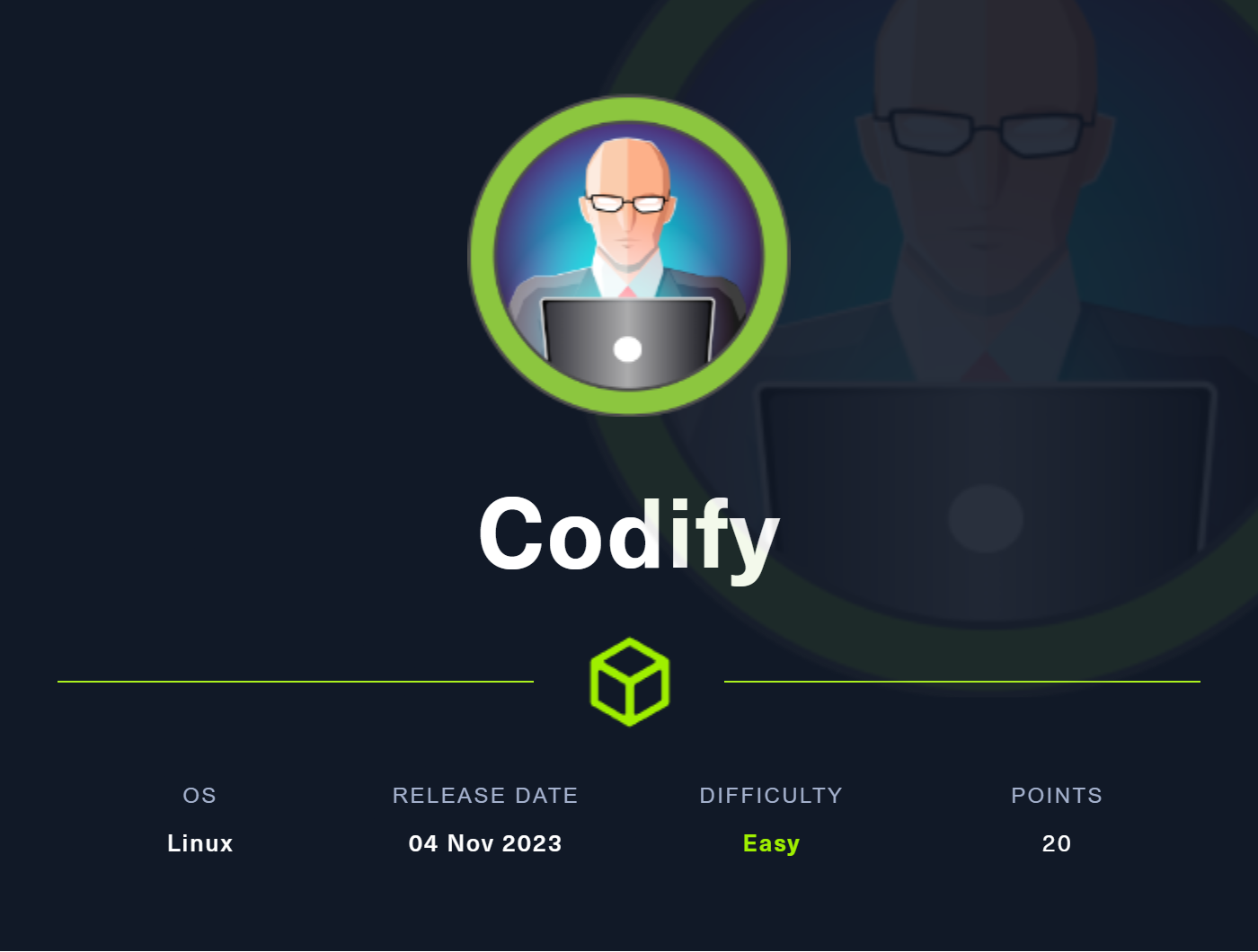 Codify an easy node.js box with some interesting concepts. The user step revolves around a Vm2 sandbox escape and some password cracking while the root step revolves around the exploitation of \* bash syntax in a script that can be run as root.