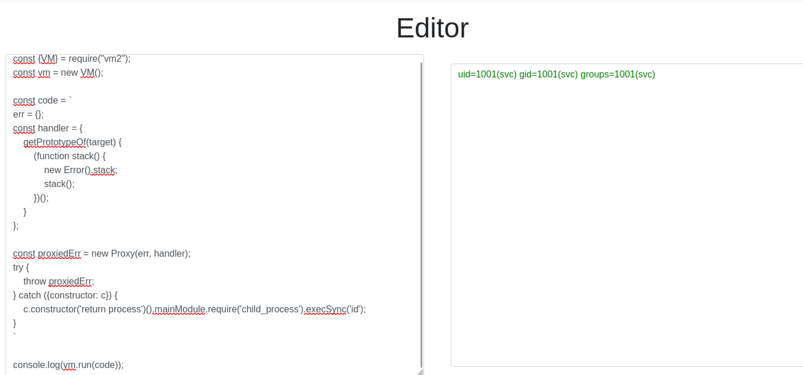 This POC shows that we are still able to call child_process to execute arbitrary code despite the apparent whitelisting and blacklisting described at /limitations. I believe this is due to the way importing and inheritance work in Javascript. We are essentially able to use child_process for code execution and escape the VM sandboxing by using the parent process of our vm sandboxing process. Changing the default payload of 'touch pwned' to a reverse shell generated by revshells we are now able to obtain our foothold shell. Don't forget we will need to prepend bash -c and escape our double quotes in order to correctly format the attack.