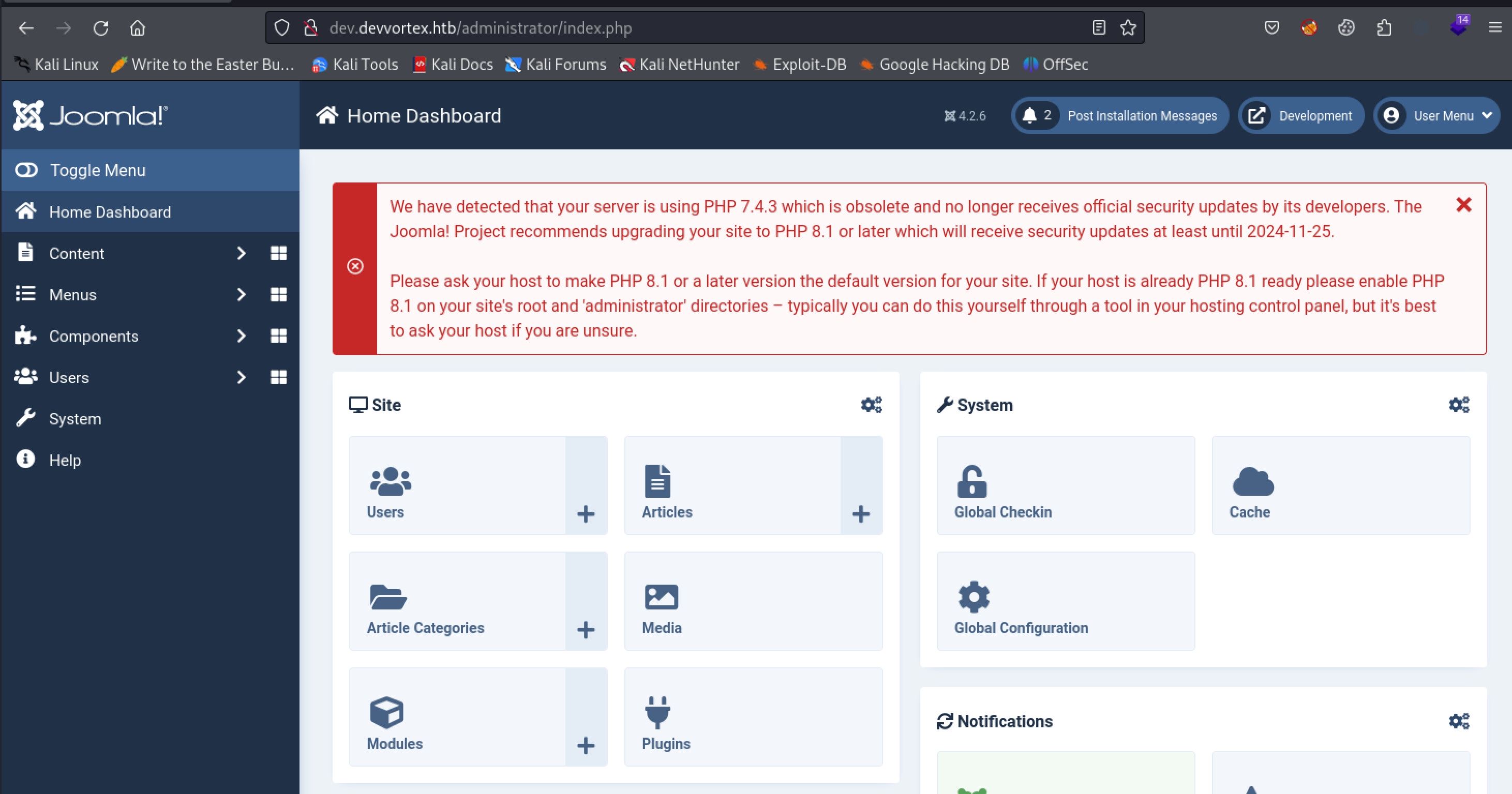 Getting User starts off by finding a second subdomain running on dev.devvortex.htb. This site is using a version of Joomla with a Information Disclosure. This Vulnerability allows us to get a username and password and login to the Joomla Dashboard. From here I exploited plugins in order to upload a web shell. I then used this web shell to run arbitrary PHP code and obtain a full shell as www-user. To finish the user step the attacker must then move laterally to the Logan user by cracking his password hash which can be found in the MySQL Joomla database.
