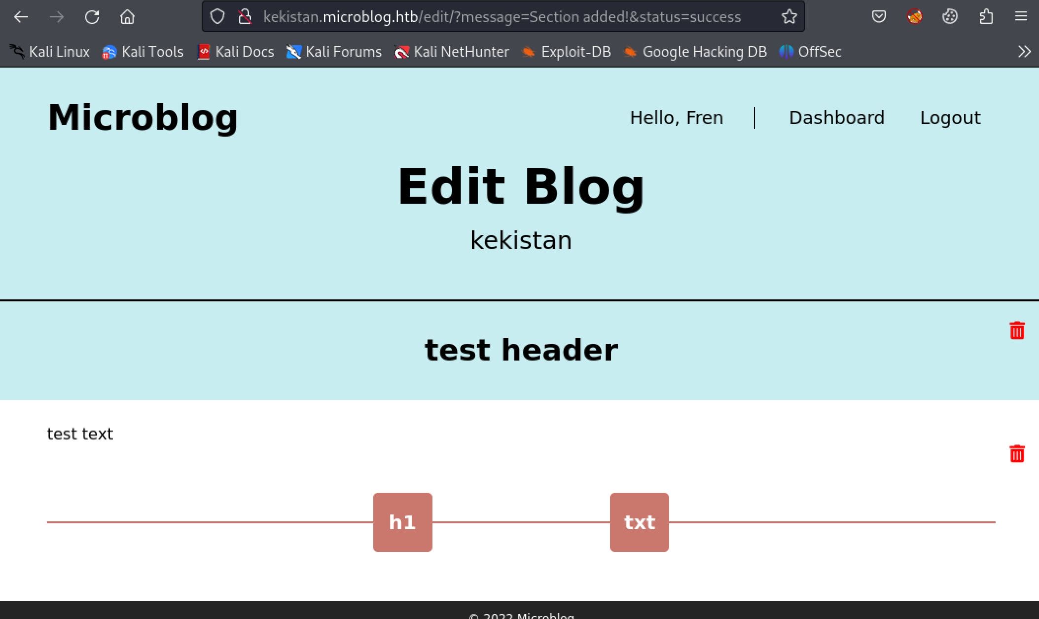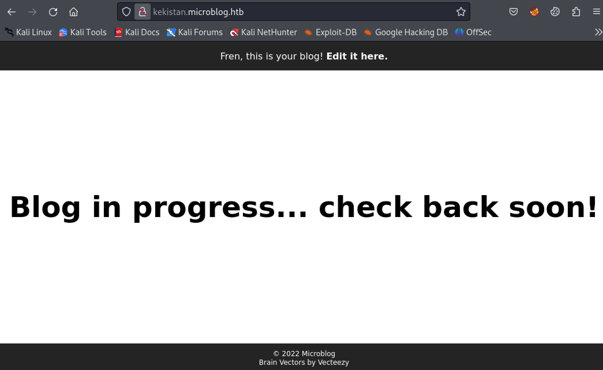 Clicking either Visit Site or Edit Site brings me to a new subdomain, kekistan,microblog.htb. I will add this to my /etc/hosts file. Each time you create a new blog you will have to add it to the hosts file in order for DNS to resolve correctly. Now visiting the site reveals a default page with the text, "Blog in progress... check back soon". At the top of the page it is echoing my username ( a possible vector of XSS or SSTI ) and a link to edit the site.