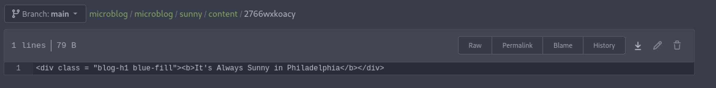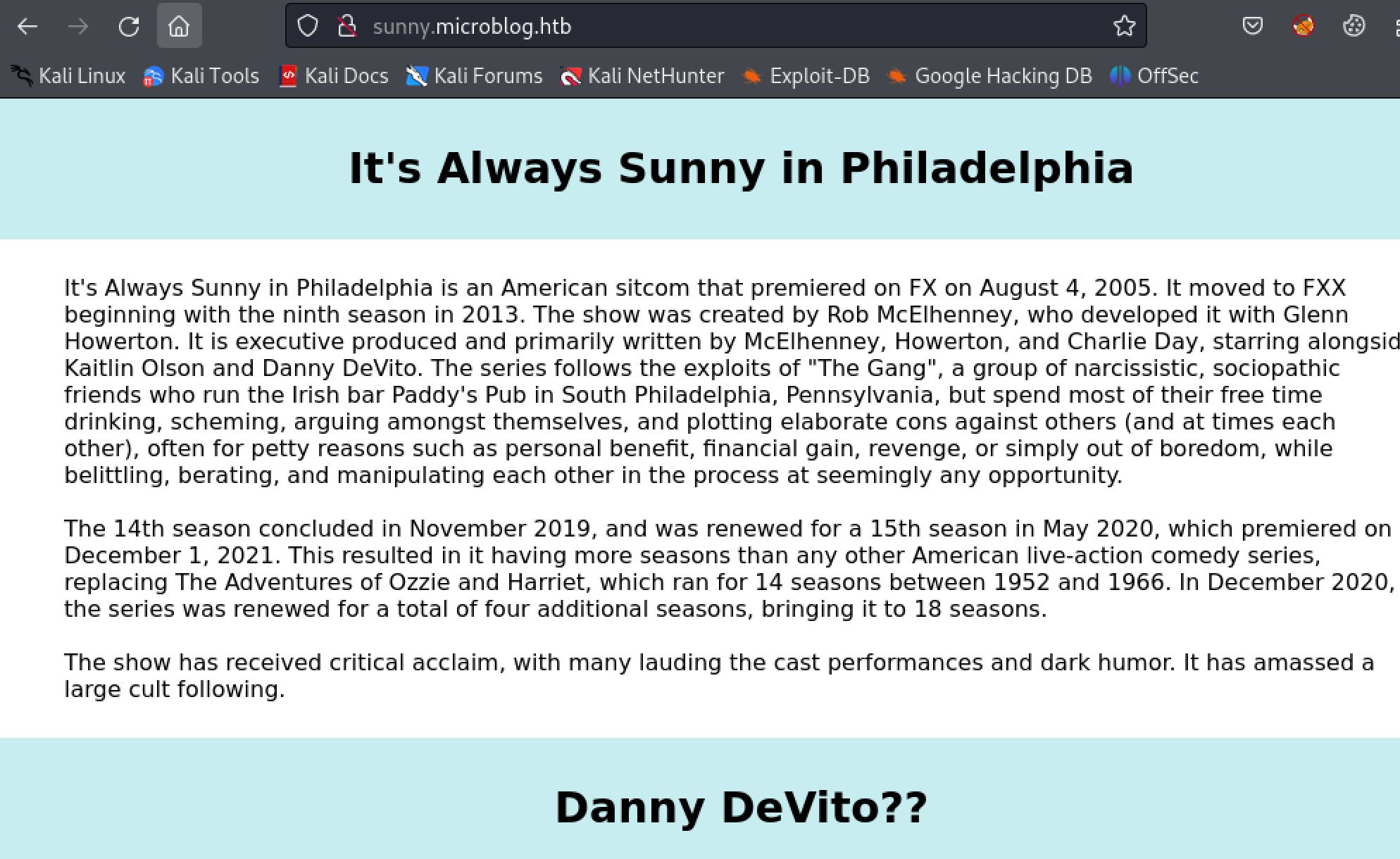 There were two more subdomains found in this case, app and sunny. I added both of those to my /etc/hosts file as well. checking out all the pages I started with the webserver on port 80. The default page is a 404 for microblog.htb. However, visiting the sunny subdomain reveals a single page talking about the show It's Always Sunny in Philadelphia.