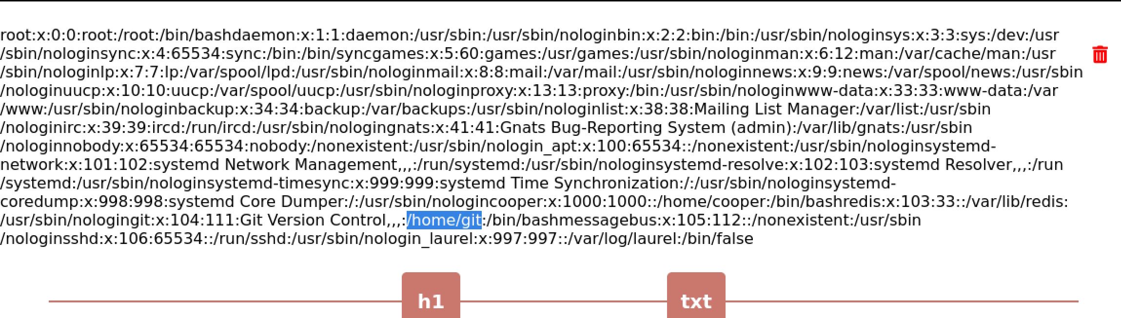 Forwarding the requests through we get back the /etc/passwd page and confirm that the ID parameter is vulnerable to LFI. We can also make a note of a second discovered user, git.