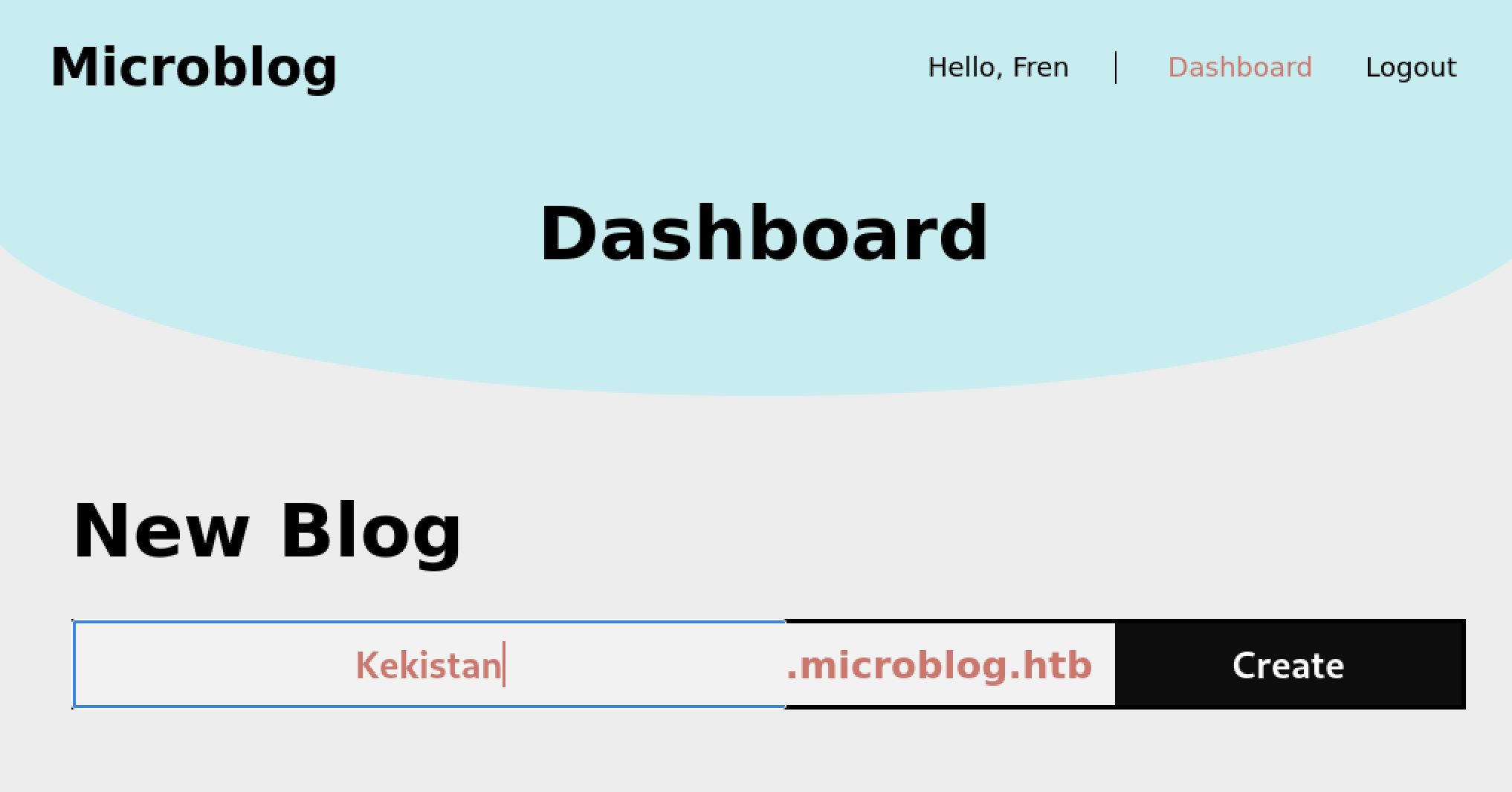 I proceeded to register a user with the name fren, as is custom. This brings us to a dashboard where the user can create a new blog. I enter kekistan into the box and hit create.