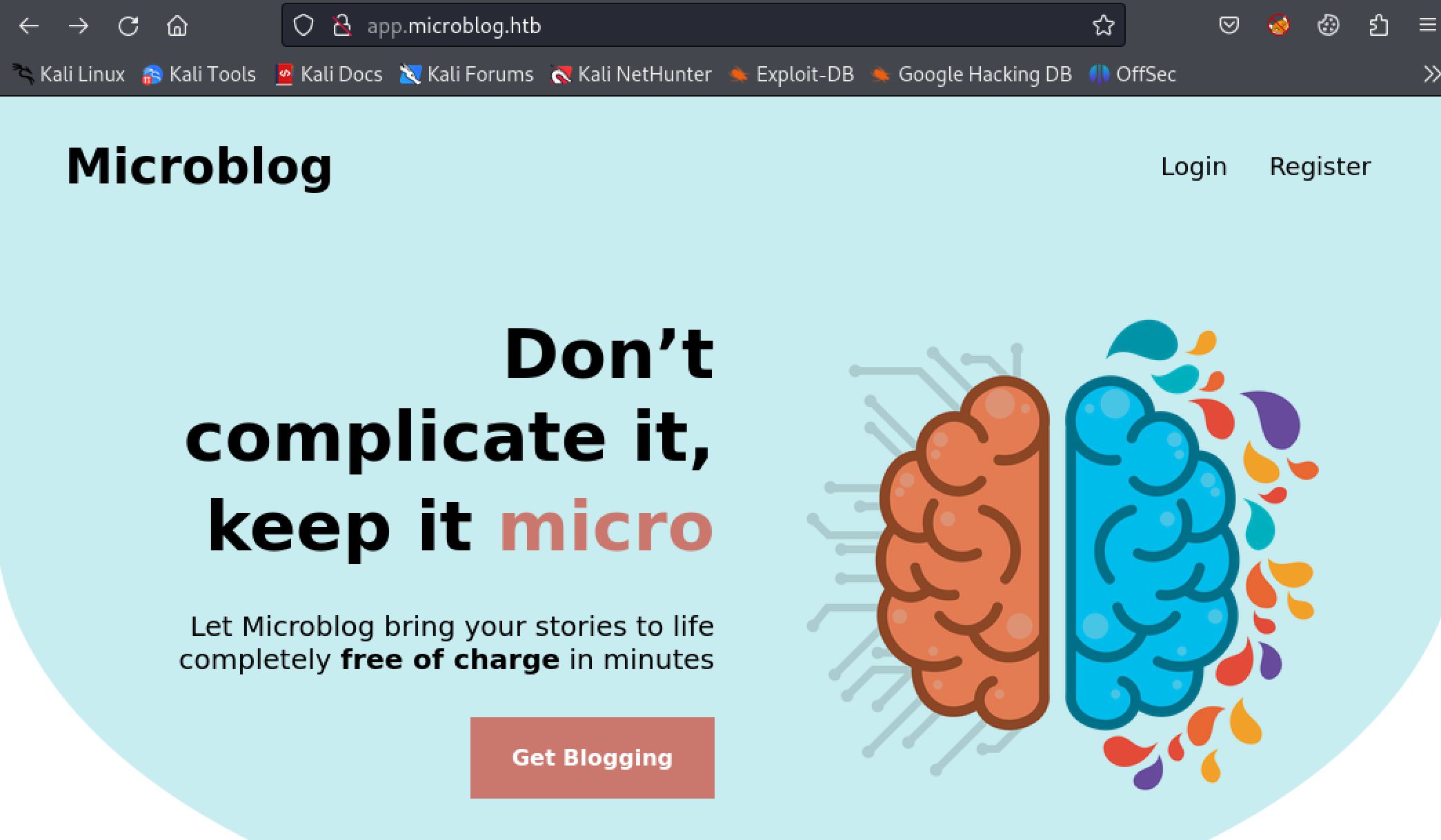 The app.microblog.htb subdomain brings us to what looks like a web application. There are options to login and register.