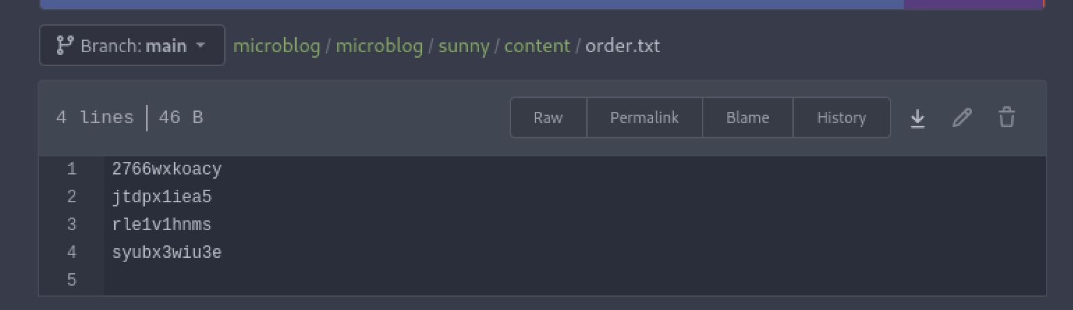I spent a while exploring all these files and the interactions they had together at this point. Looking at the sunny microblog there is a content folder that contains all the elements of the always sunny in philadelphia website we had visited. In this folder there are a bunch of files with names that appear like the ID parameter we found when intercepting the request with burp. There is also an order.txt file that lists all the names of the content files as they appear on the site. Another thing to note is that the files are in HTML, leaving me to think that the site is not doing any filtering and could be vulnerable to XSS attacks.