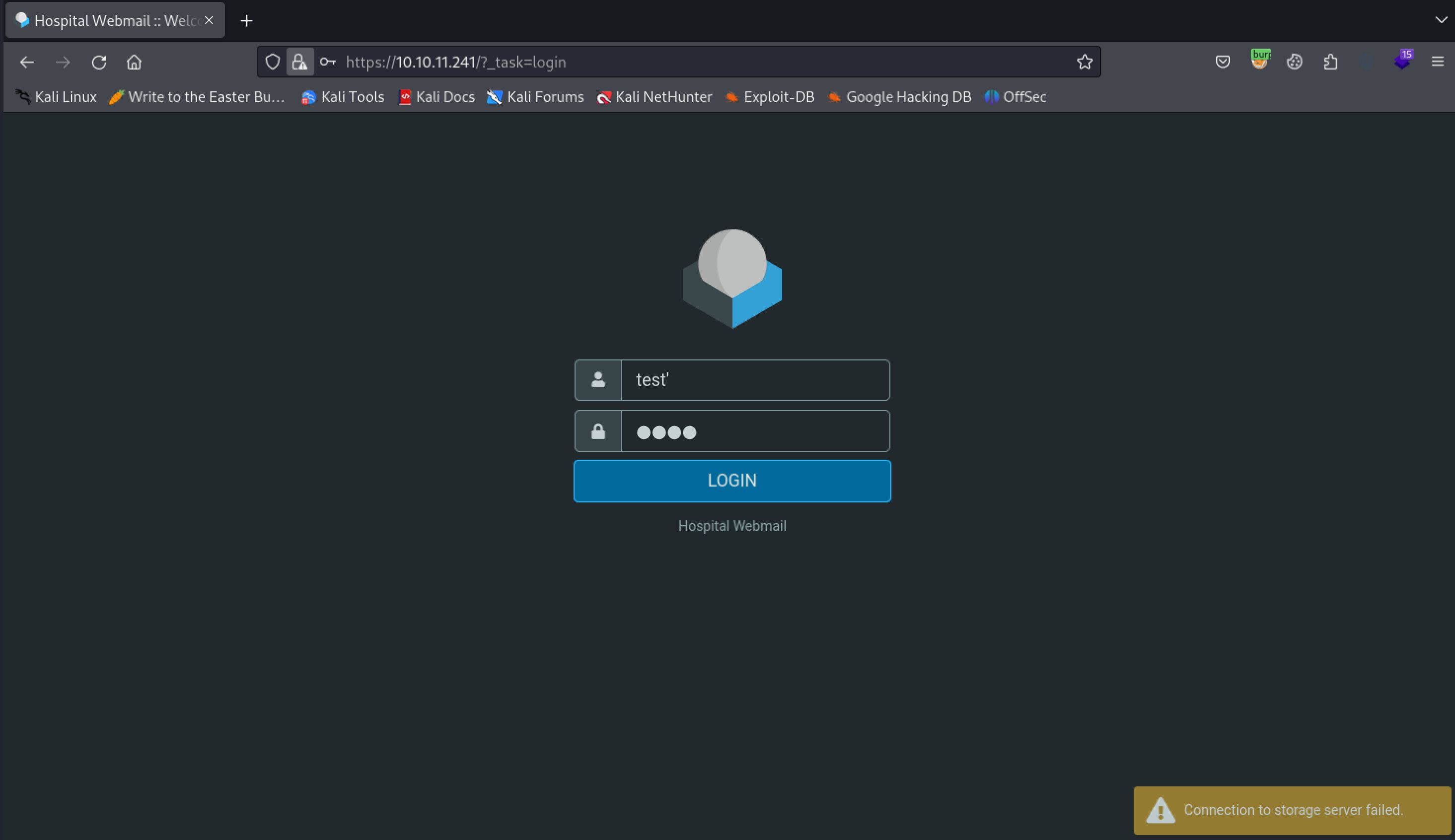 Passing this into john we can crack DrWilliams password to qwe123!@#. Sadly this password does not work with SSH on the underlying windows host. We can however use it to login to the webmail application on port 443 using drwilliams@hospital.htb and his password.