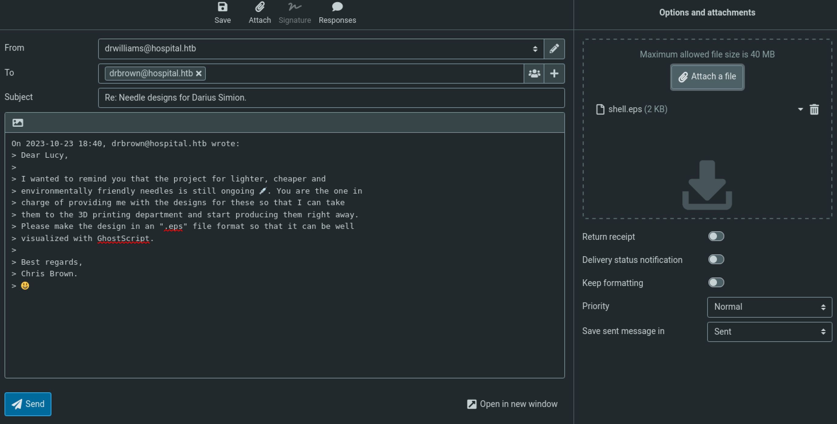 Logging into the webmail application as drwilliams@hospital.htb and using qwe123!@# we can see a message about .eps files being used with Ghostscript.