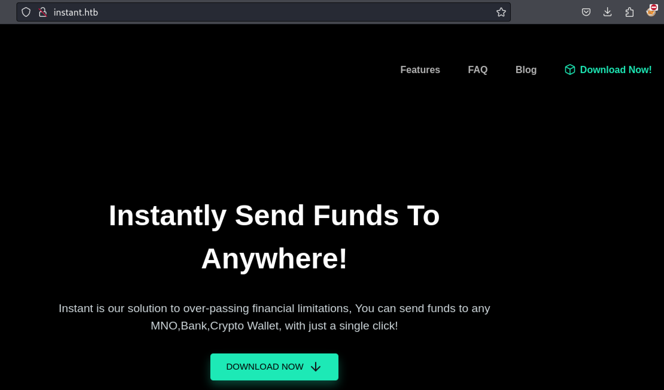 Up next in the enumeration steps is to check out the webserver on port 80. It appears to be a basic company page for a money transfer application. There is a Download Now! button in the top right that points to /downloads/instant.apk. Looks like we will need to do some basic android hacking, exciting!