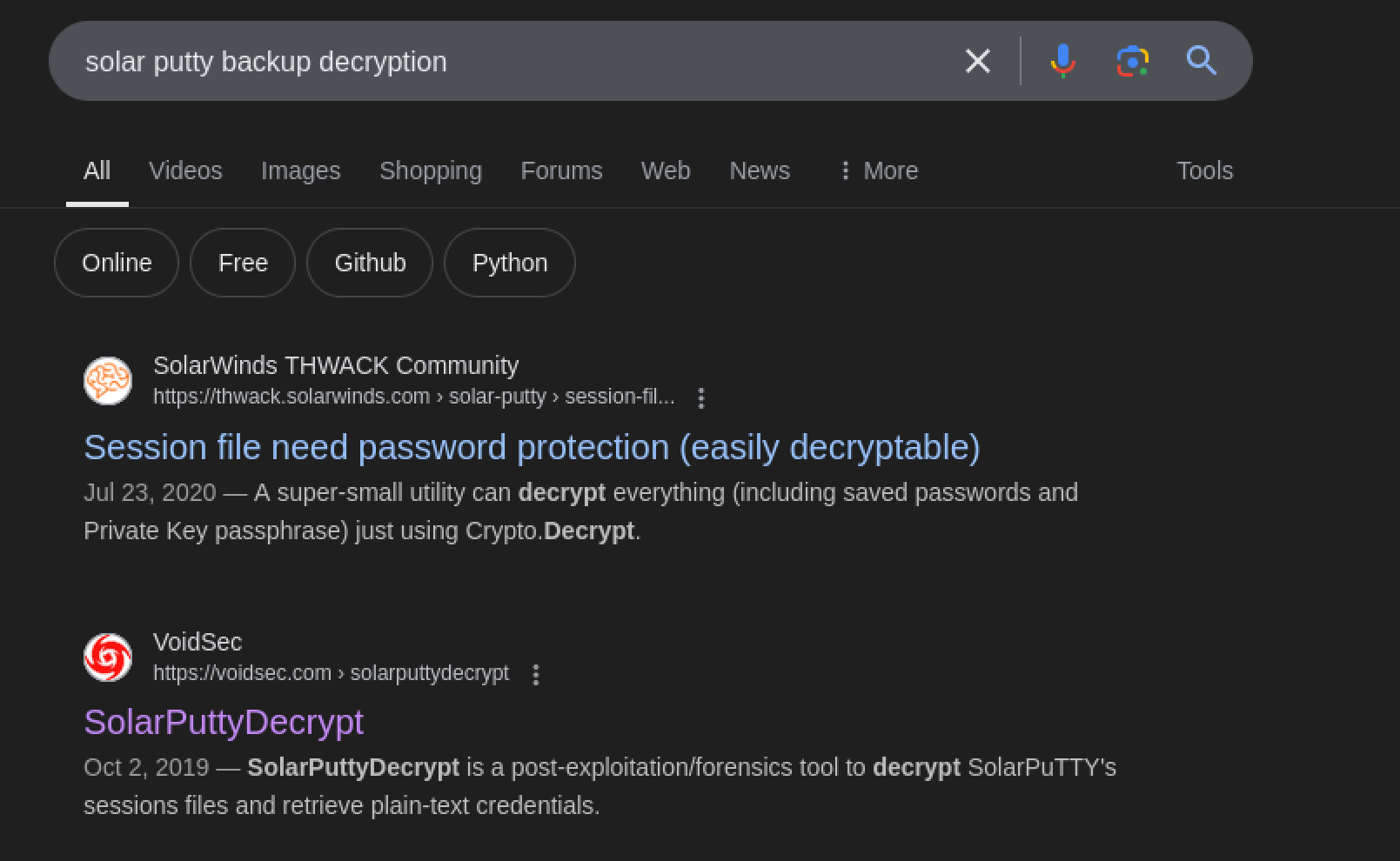 at Crypto.Decrypt(String passPhrase, String cipherText) in C:\Users\VoidSec\Documents\GitHub\SolarPuttyDecrypt\SolarPuttyDecrypt\Program.cs:line 122