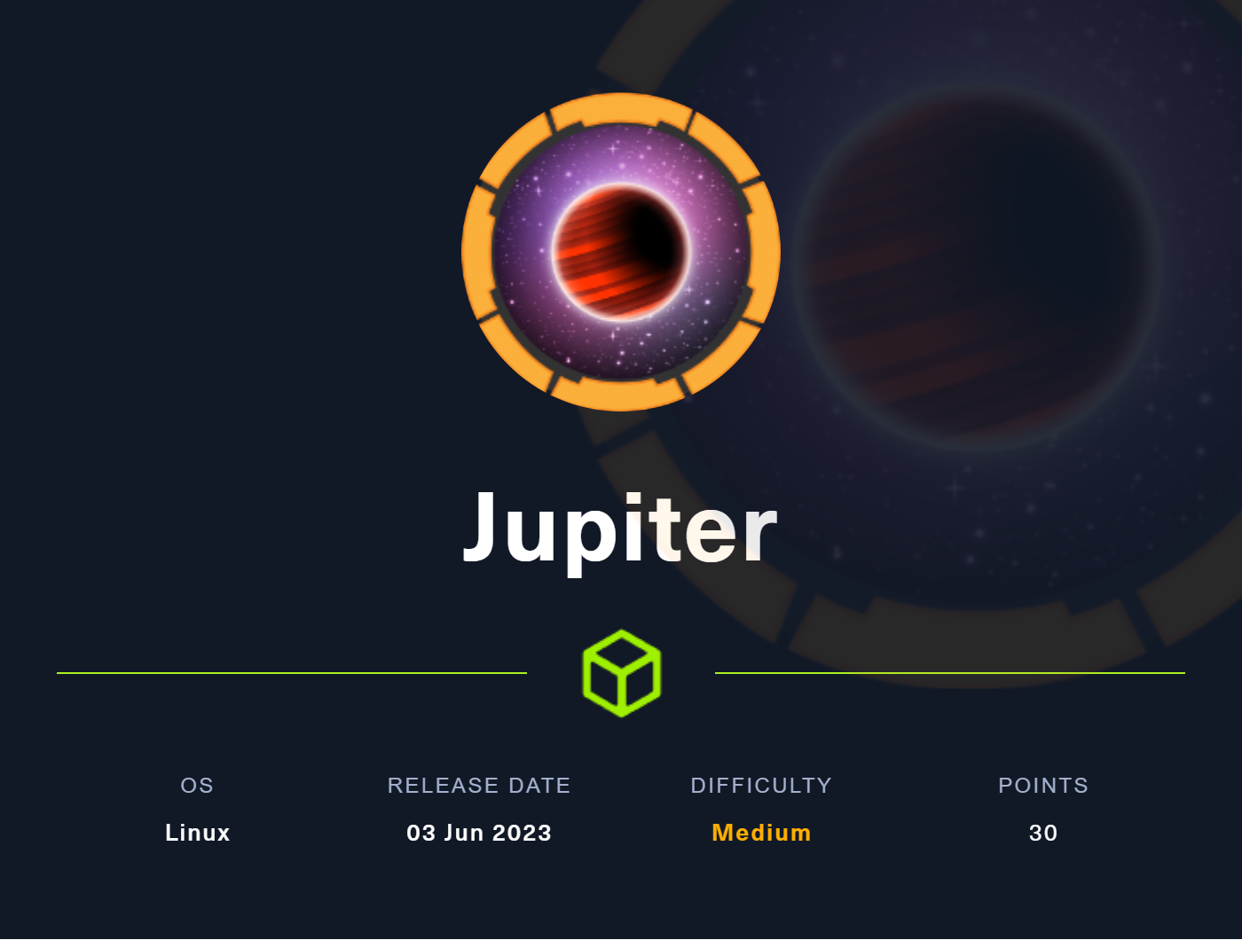 Jupiter is a bit of a tedious medium box due to a large amount of lateral movement being required. To obtain a foothold the attacker starts off by discovering a new subdomain. On this subdomain there is a POST request that can be intercepted that runs arbitrary sql. This can be abused to obtain code execution and a reverse shell. From here the attacker must move laterally to a new user by abusing a configuration file that is writable but not owned by the current user. Obtaining a shell as this first user allows for the attacker to grab the user.txt file.