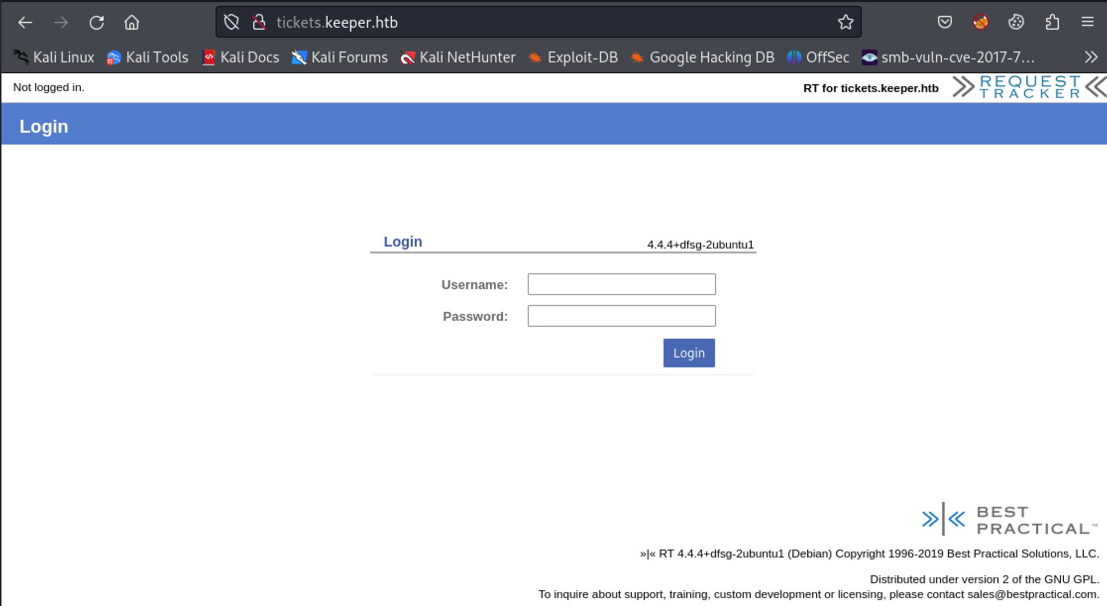 The site appears to have a link to "raise an IT support ticket" that points to tickets.keeper.htb/rt/. As such I added tickets.keeper.htb and keeper.htb to my /etc/hosts file. I also ran a subdomain brute force scan with wWuzz, this also returned nothing of value. Visiting the link reveals a Request Tracker application running version 4.4.4.