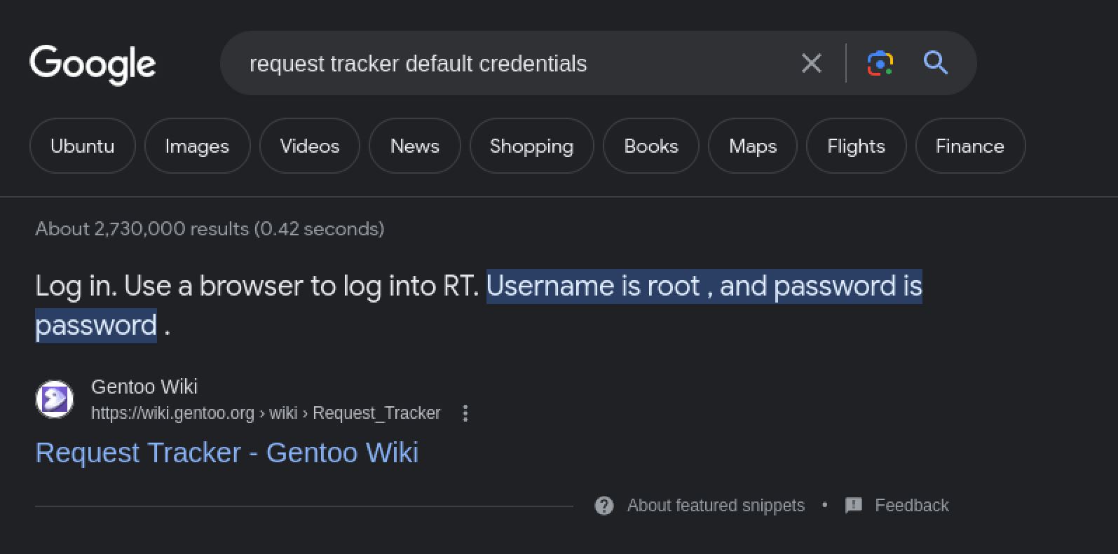 As this is a new subdomain I once again ran Feroxbuster to attempt directory busting. This once again didn't turn up anything of value. Searching for exploits based on the application was also a fruitless effort. I always search for default credentials for web applications as one of my first enumeration steps. A simple google search in this case reveals that there is a default account for this application!