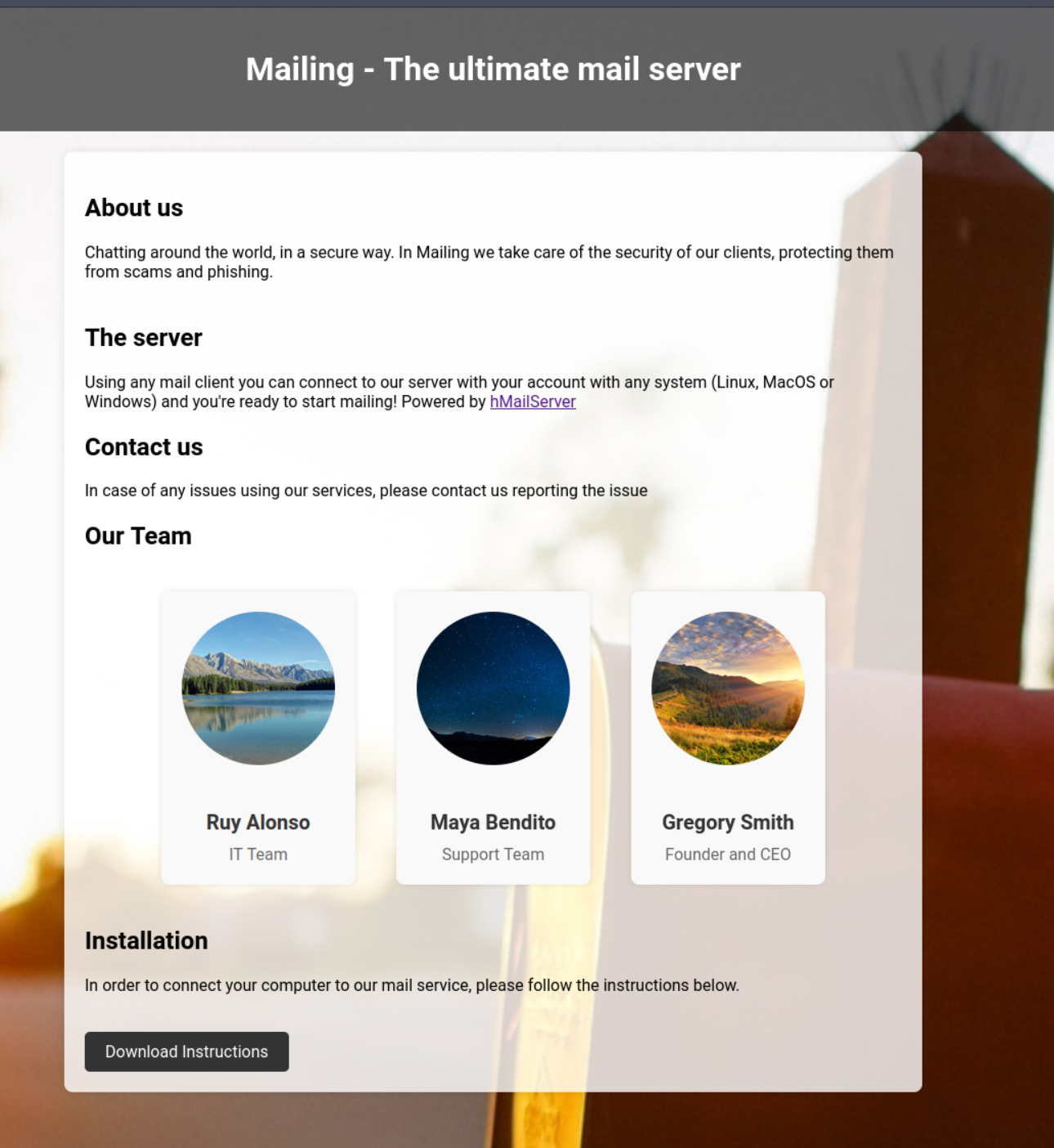 Up next for basic enumeration is the web site on port 80. There appears to be a single page titled Mailing - The ultimate mail server. There is a mention it is powered by hMailServer, something to check later for public exploits. Lastly, on the bottom of the page there is a button for Download Instructions.