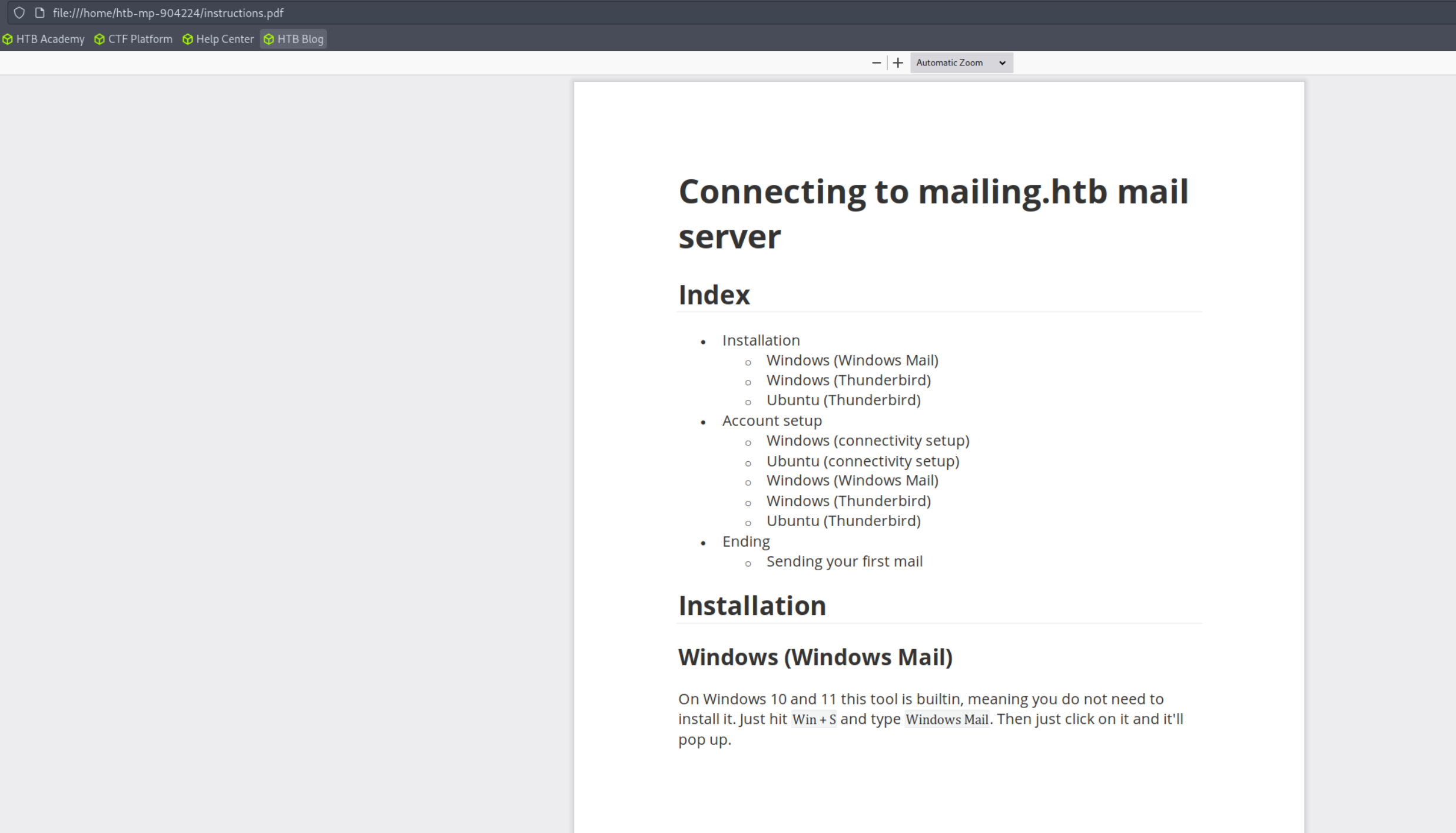 Clicking the download button gives us instructions.pdf that contains step by step instructions on connecting to mailing.htb mail server.