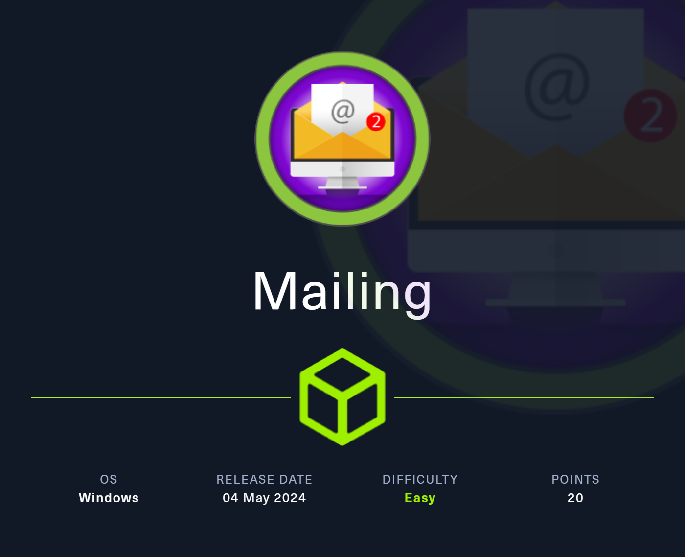 Mailing was an easy Windows box that could likely have been made medium. It centers around mail services and exploiting an hMailServer as well as loads of enumeration and finding public exploits. There are some cool techniques involved such as stealing an NTLM hash using CVE-2024-21413 and privilege escalation using CVE-2023-2255 and python to evade Windows Defender.