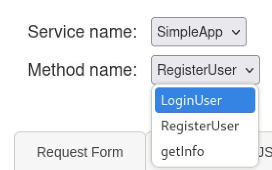 using this web ui we can see the service name is SimpleApp and we have 3 methods, LoginUser, RegisterUser, and getInfo. we can also create a user and log them in and will get back an ID and a cookie.