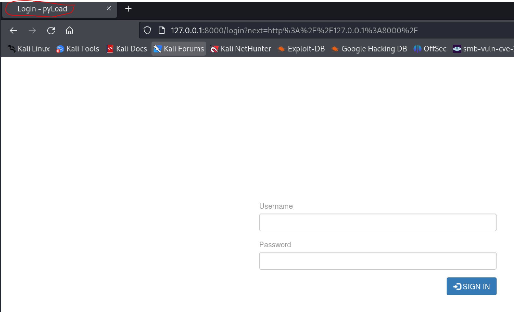 Visiting 127.0.0.1:8000 brings us to a login page with a title of pyLoad.