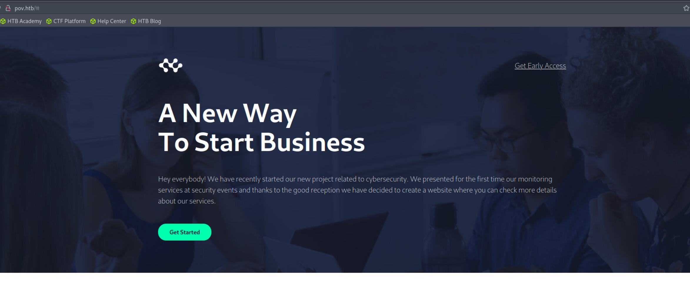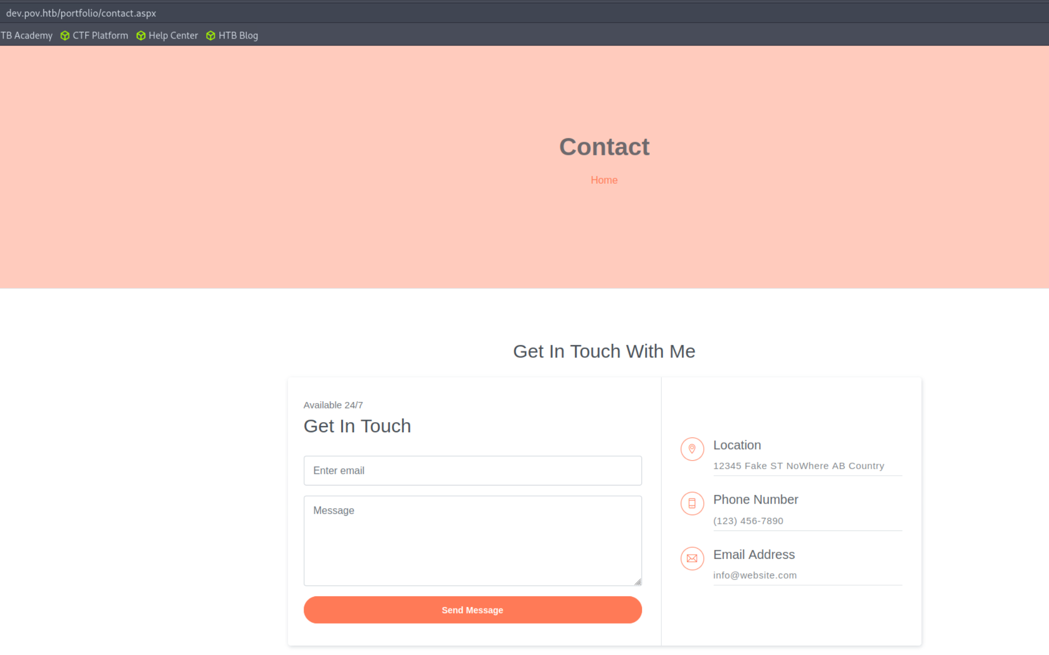 It quickly became apparent that there was nothing to interact with on the default host. Switching over to the dev.pov.hrb virtual host we are given a much more interesting website. This appears to be a basic about page. All of the links are simply anchored to the index page except for contact which brings us to a simple contact.aspx form.