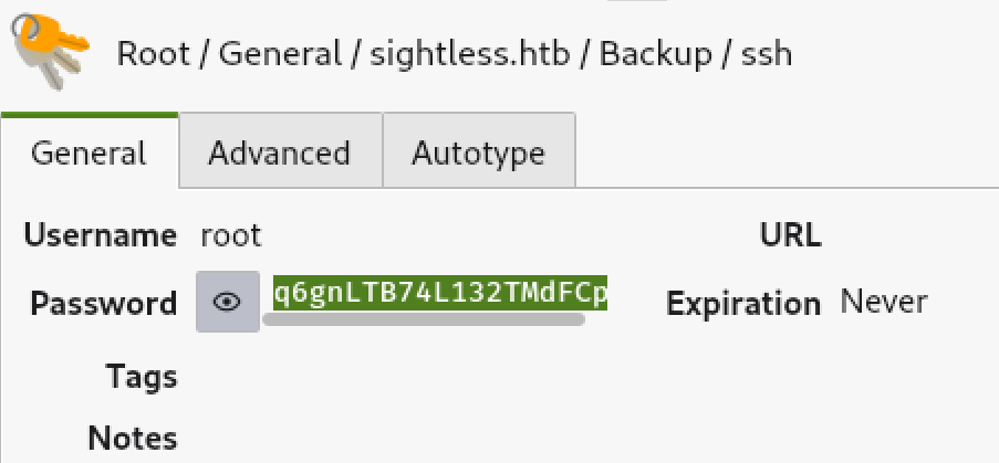 Root took much longer and was much more complex than the user for Sightless in my experience. First it must be enumerated that a Froxlor web server is listening locally on port 8080. A tunnel must then be established to reach this website. There is a public CVE that leverages unauthorized blind XSS to create a user account that can then be used. After getting logged in to the Froxlor application, the FTP password for the web1 user can be reset. In the ftp server is a keepass database and the last step is to crack the master password for this database. The attacker is then presented with Roots ssh key which can be used to login and complete the box.