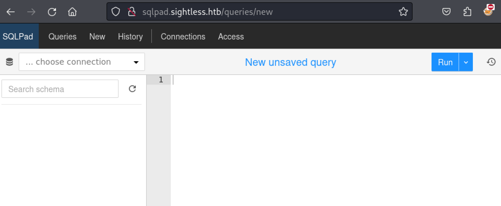 Looking at the buttons on the site we can find an email address, possibly to use in a phishing attack later: sales@sightless.htb. There is also a link to a sqlpad.sightless.htb subdomain site that can be discovered by clicking the _start now_ button.