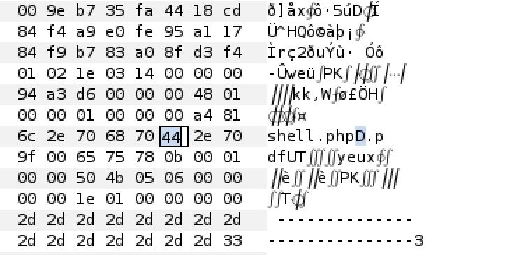 Zipping up the new shell.phpD.pdf file, uploading it, and catching the request with burp I found the last instance of the shell.phpD.pdf string and replace the 44 representing a D with a 00 null byte.