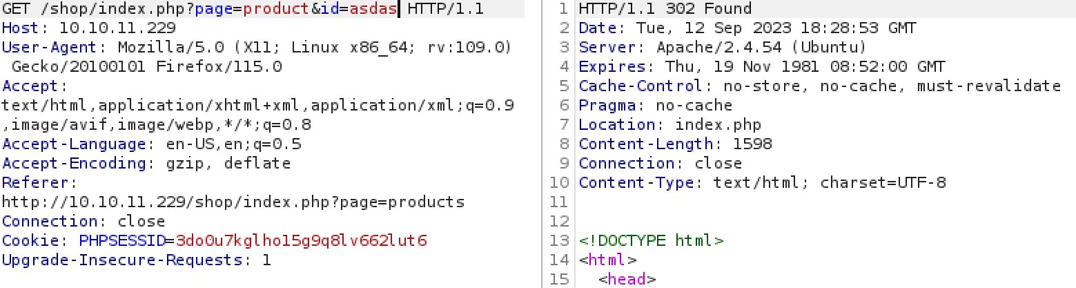 As product.php's injectable parameter, id, appears to be loaded by /shop/index.php ( http://10.10.11.229/shop/index.php?page=product&id=1) when clicking on a product, I will capture that request in burp to make it easier in attempting the SQLI. Sending any invalid request that hits the filter results in a 302 found response linking back to index.php as outlined in the product.php code.