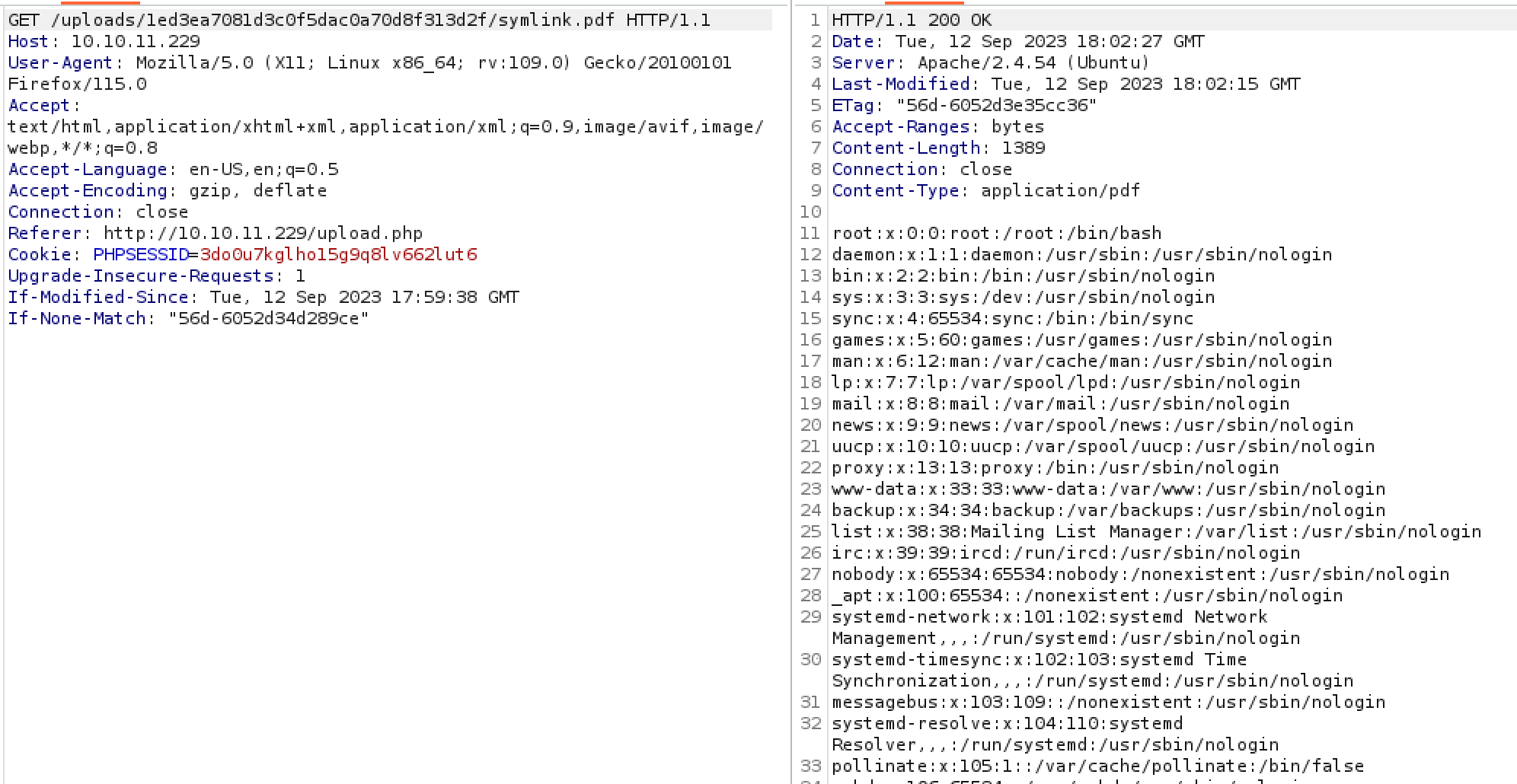 Attempting the Symlink exploit I created a link to /etc/passwd and zipped it into a zip archive. I then simply uploaded it onto the site. Visiting the page will result in a blank PDF. This is because the data that is being returned is not correctly formatted as a PDF but the server is attempting to display it as one anyways. To fix this I simply reuploaded the zip archive but caught the link request in burp and then sent it to the repeater to see the raw response.