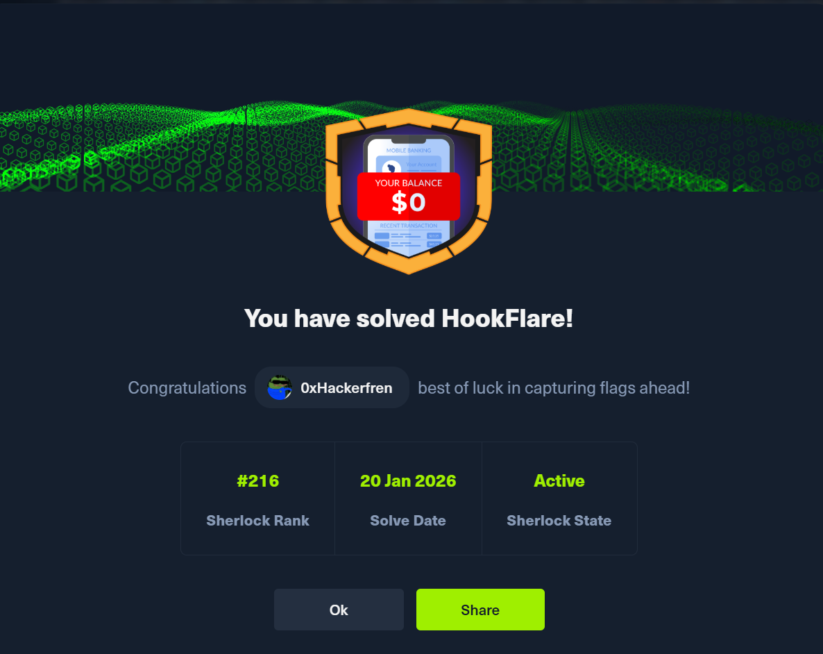 HookFlare is a medium difficulty DFIR investigation focusing on Android mobile forensics. It presents a realistic banking trojan scenario that tests your ability to navigate Android artifacts and decompile malicious APKs. The investigation centers on a smishing attack where the victim received a fake fraud alert and installed a trojanized banking app. What I appreciated was the depth of the attack chain: from the initial SMS to APK analysis to actually decrypting the stolen payment data. The questions guide you through a logical forensic workflow, building from timestamps through to full malware analysis. The challenge of working with Android disk images and understanding Chrome's unusual timestamp format kept things interesting.