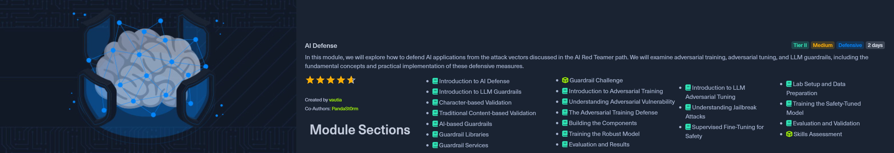 Created by vautia with PandaSt0rm, this 21-section capstone module is estimated at 2 days and brings everything full circle. After spending the path learning to attack AI systems, you now learn to defend them, understanding both sides of the adversarial equation.