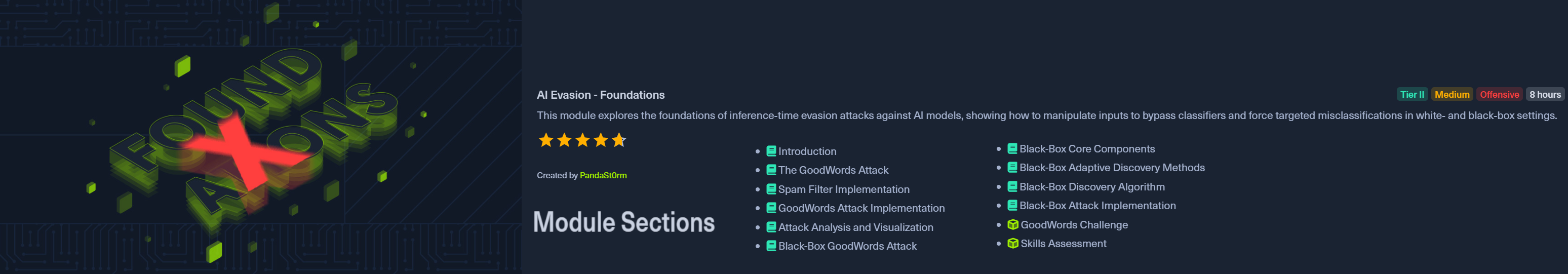 Created by PandaSt0rm, this 12-section module runs about 8 hours and kicks off the three-module evasion series. It introduces inference-time evasion attacks, techniques that manipulate inputs to bypass classifiers or force targeted misclassifications at prediction time.