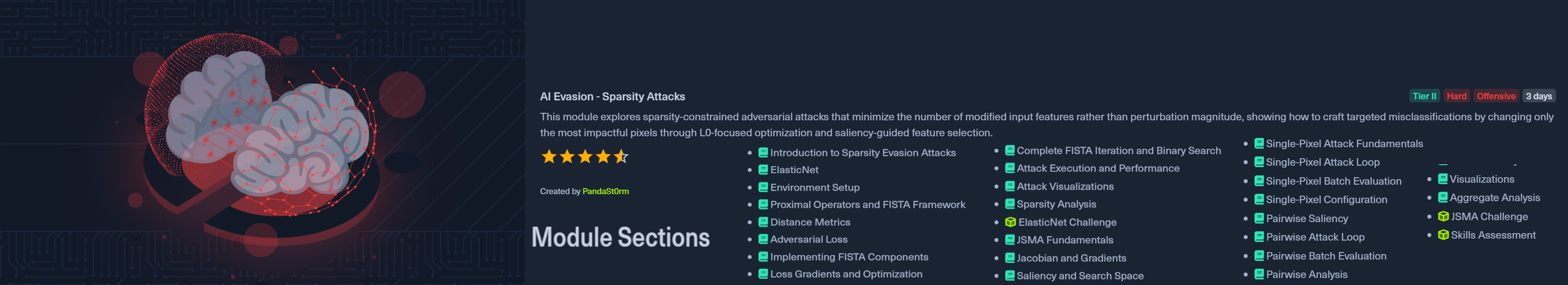 Created by PandaSt0rm, this 28-section module is estimated at 3 days and is the most technically dense of the evasion trilogy. Where first-order attacks focus on minimizing perturbation magnitude, sparsity attacks flip the constraint: minimize how many features change, not how much they change.