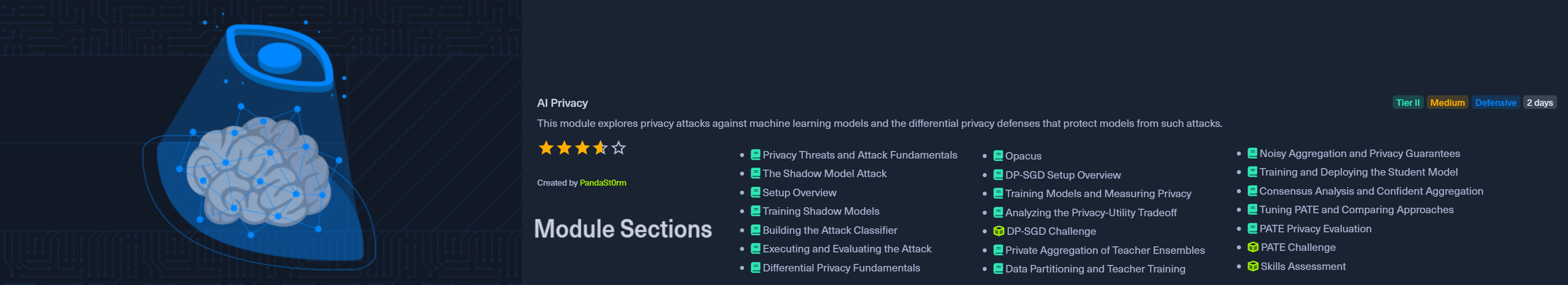 Created by PandaSt0rm, this 21-section module is estimated at 2 days and is notably the first Defensive-focused module in the path. It explores the privacy dimension of AI security, both the attacks that extract sensitive information from trained models and the defenses that protect against them.