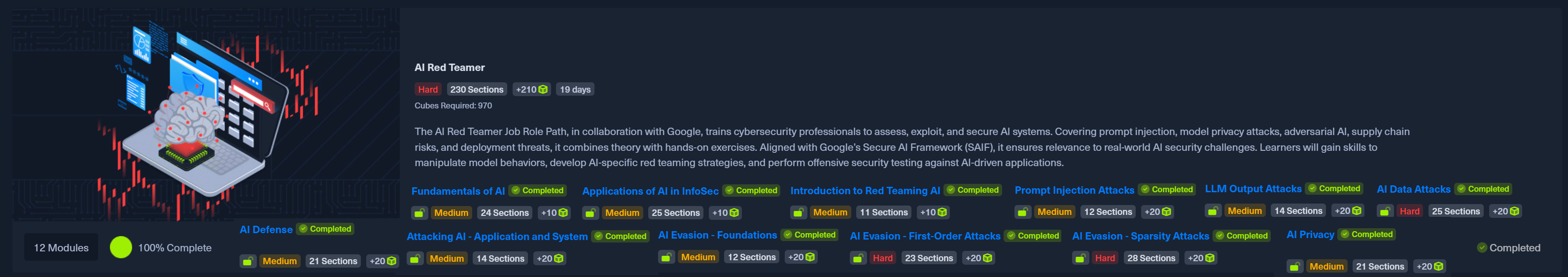 The AI Red Teamer path delivers on its promise. At an estimated 19 days of content, it took me about 2 months to complete while balancing other commitments. That time investment was worth every hour. The path takes you from zero AI security knowledge to being capable of performing meaningful offensive assessments against AI systems, while also equipping you to recommend and implement defenses. The collaboration with Google shows in the quality and real-world relevance of the content.