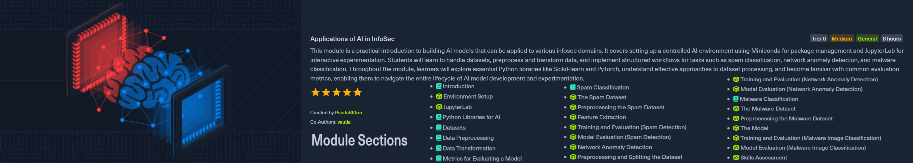 Rated Medium and costed at Tier 0, I'd say that's spot on. The module guides you through each step in detail without leaving you stranded. What I thoroughly enjoyed was how applicable everything felt, by the end I had working proof-of-concept models for real-world cybersecurity use cases: spam detection, network anomaly detection, and malware classification. That's not just theory, that's something you can actually build on.
