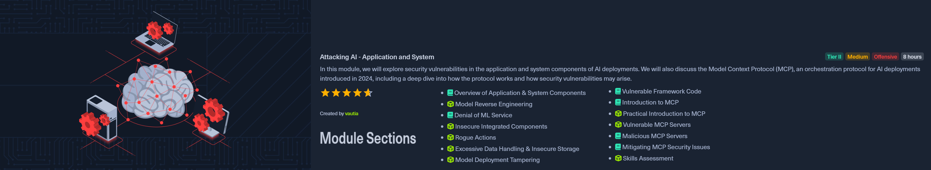 Created by vautia, this 14-section module runs about 8 hours and zooms out from model and data attacks to examine the application and system layers of AI deployments. After the math-heavy data attacks module, this returns to Medium difficulty while covering equally critical attack surfaces.