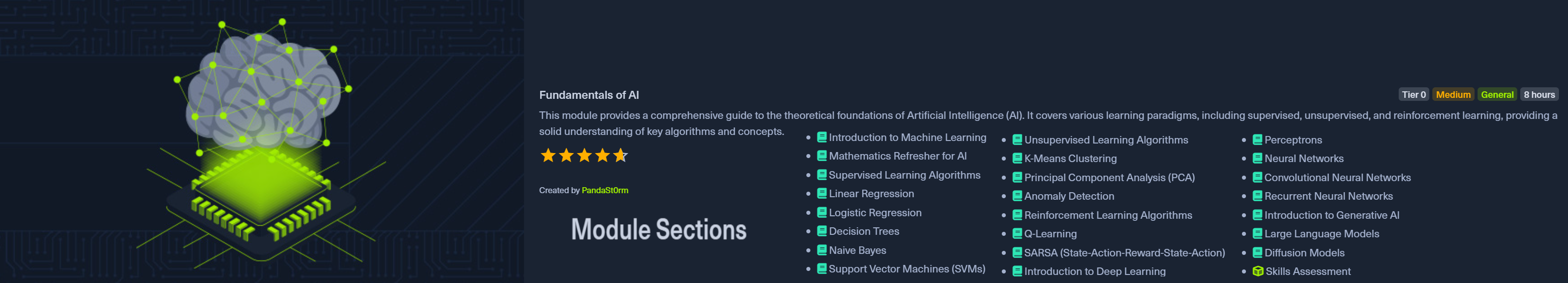 Created by PandaSt0rm, this foundational module clocks in at around 8 hours across 24 sections of pure theory, no hands-on exercises, no labs, just a deep dive into the concepts that underpin AI systems. It serves as both an approachable introduction and a reference you'll come back to throughout the path. The content spans five major domains: