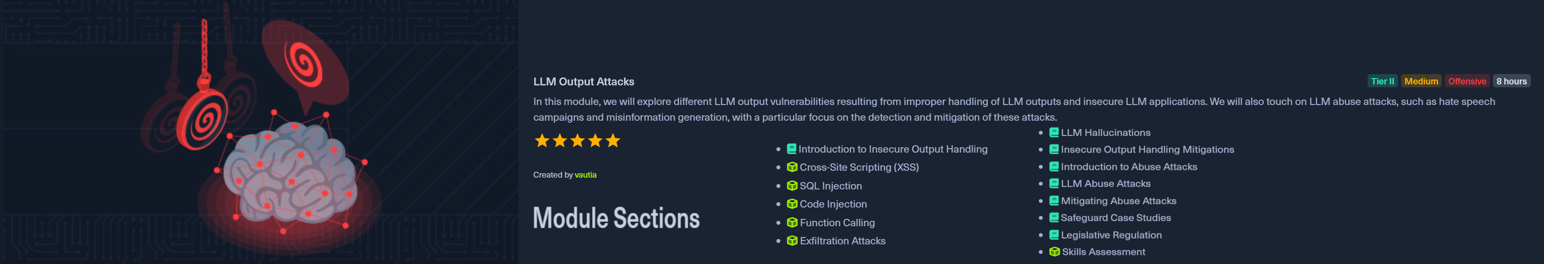 Created by vautia, this 14-section module runs about 8 hours and flips the script from input manipulation to output exploitation. Where prompt injection focuses on what goes into an LLM, this module examines what comes out and how that output can compromise systems.